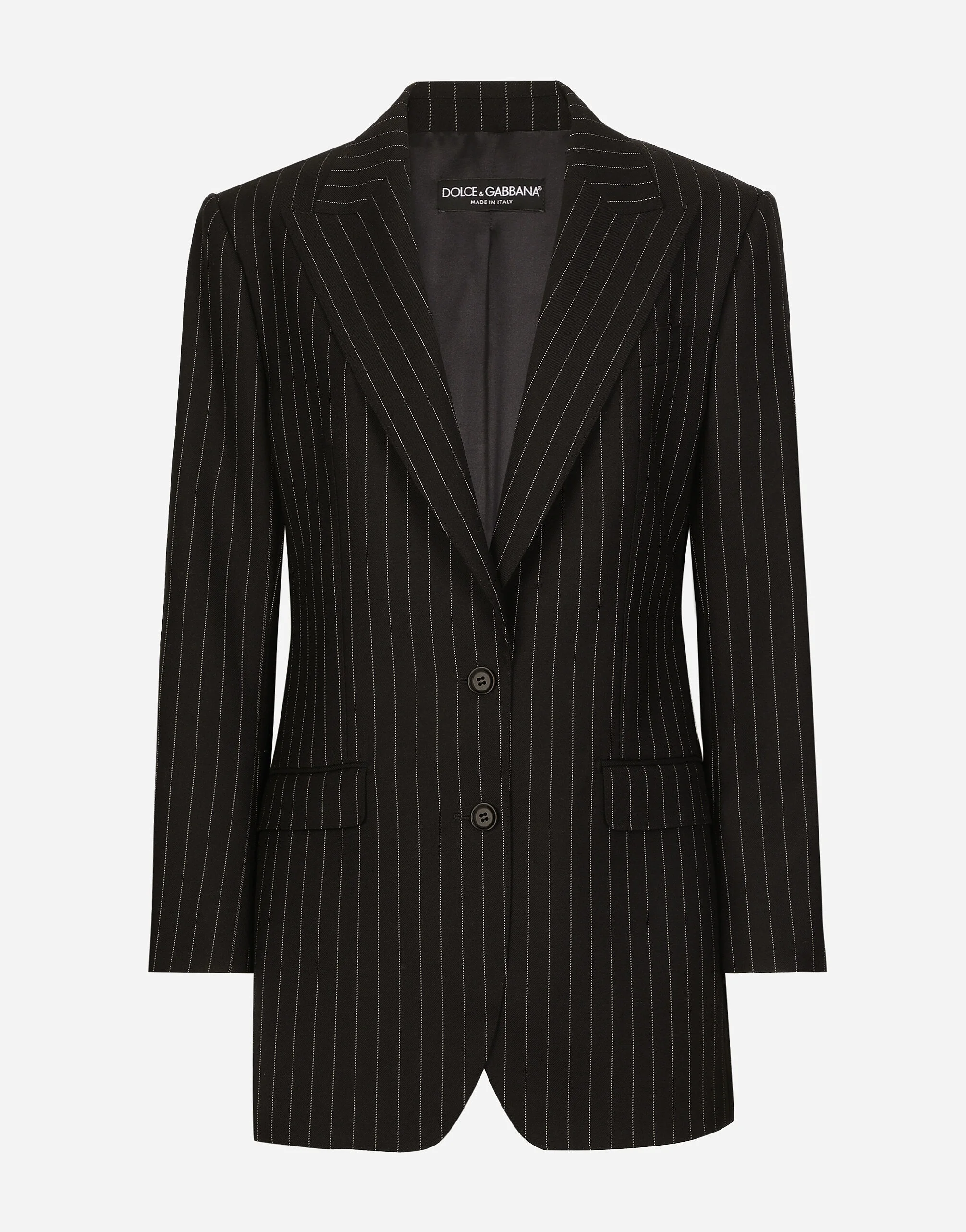 Inspired by 80s fashion photography, the Black Sicily collection masterfully blends masculine and feminine elements, pairing tailored cuts and corset details for the FW 24/25 season. A new vision of the iconic Nero Sicilia black is conveyed through contemporary and sensual looks: jackets and skirts in all-over glen plaid pair with openwork socks, while the 50s-inspired Mun shoes with Eva heel go with the houndstooth Sicily bag featuring crocodile-print leather inserts. Single-breasted pinstripe wool jacket: • Black • Notched lapels • Long sleeves • Flap pockets • Comfortable fit • Silk satin lining • Button fastenings • The piece measures 75 cm from the center back on a size IT 40 • The model is 175 cm tall and wears a size IT 40 • Made in Italy External composition: 100% Virgin Wool Internal composition: 100% Silk