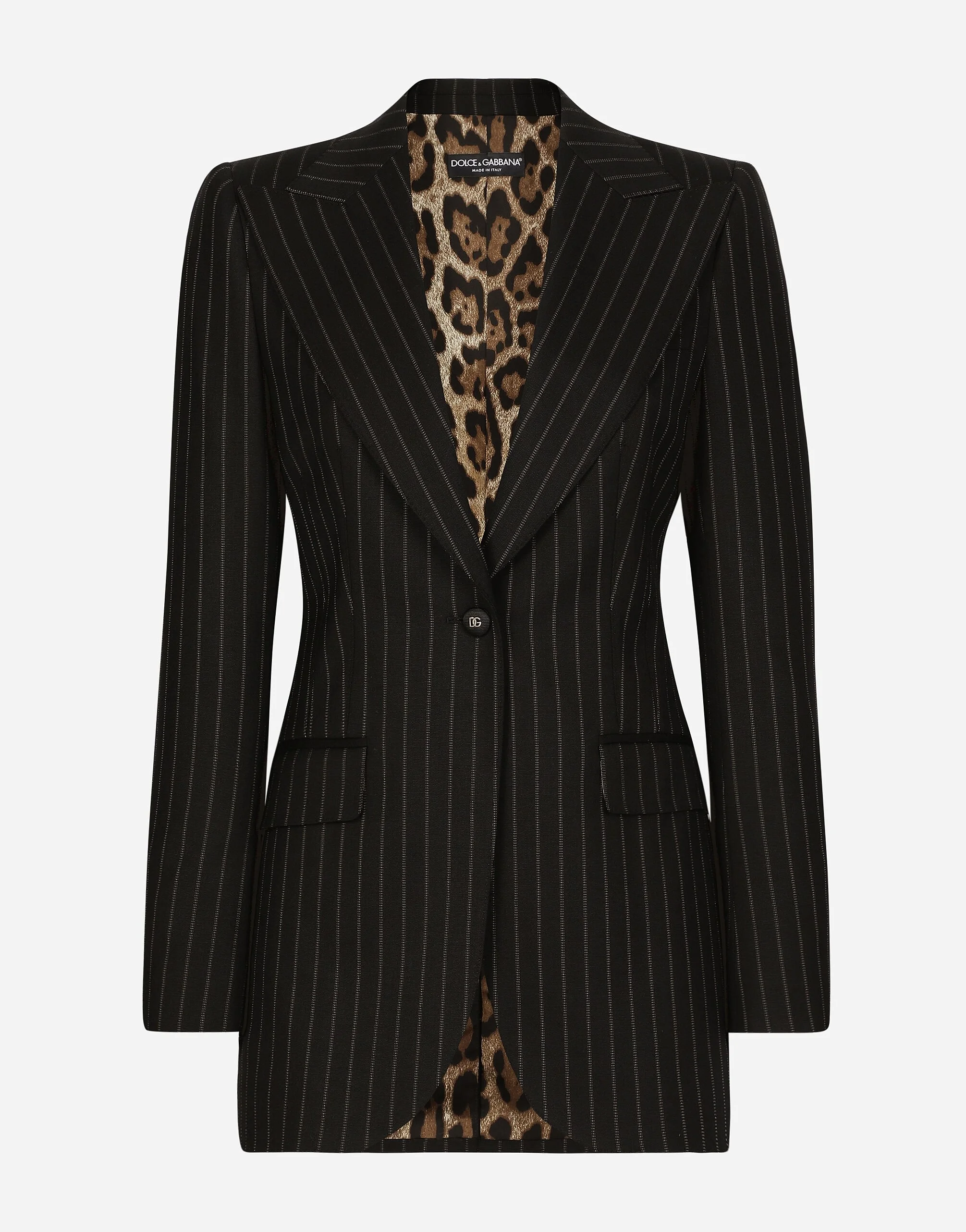 In the Black Sicily Collection, black, the absolute protagonist, becomes sensual black, sheer black, Dolce&Gabbana black. The key concept is “Black on Black”. Playing around with proportions, volumes, layered fabrics and sheer details, this style becomes absolute, bold and sexy. Unique and unmistakable, it is conveyed through the contrasts between glossy and matte fabrics, lines, volumes and special details, thereby expressing a woman’s various personalities and the true identity of Dolce&Gabbana. Single-breasted pinstripe stretch wool Turlington jacket: • Black • Peak lapels • Long sleeves • Flap pockets • Leopard-print stretch satin lining • Covered button fastening • The piece measures 71 cm from the center back on a size IT 40 • The model is 175 cm tall and wears a size IT 40 • Made in Italy External composition: 96% Virgin Wool 2% Spandex 2% Polyester Internal composition: 97% Polyester 3% Spandex