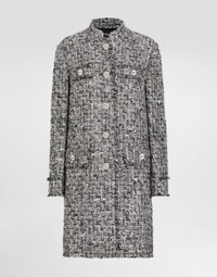 The Everyday Women's Collection reimagines contemporary daily wear with Dolce&Gabbana's signature style codes. Iconic fabrics mix with standout details like embroidered flowers, crystals, and jewel buttons, infusing elegance into every look. Gray animal print accented with green and purple, hyper-geometric jewelry, voluminous shapes and transparencies add unique touches. Men's tweed is reinvented with graphic twists, creating distinctive pieces that reflect refined sensuality. Single-breasted raschel tweed coat: • Gray • Round neck • Long sleeves • Welt pockets with flaps • Stretch silk satin lining • Metal button fastenings with DG logo • The piece measures 95 cm from the center back on a size IT 40 • The model is 175 cm tall and wears a size IT 40 • Made in Italy External composition: 37% Acrylic 24% Linen 13% Polyester 10% Cotton 08% Metallic Polyester 06% Polyamide 02% Viscose Internal composition: 92% Silk 8% Spandex