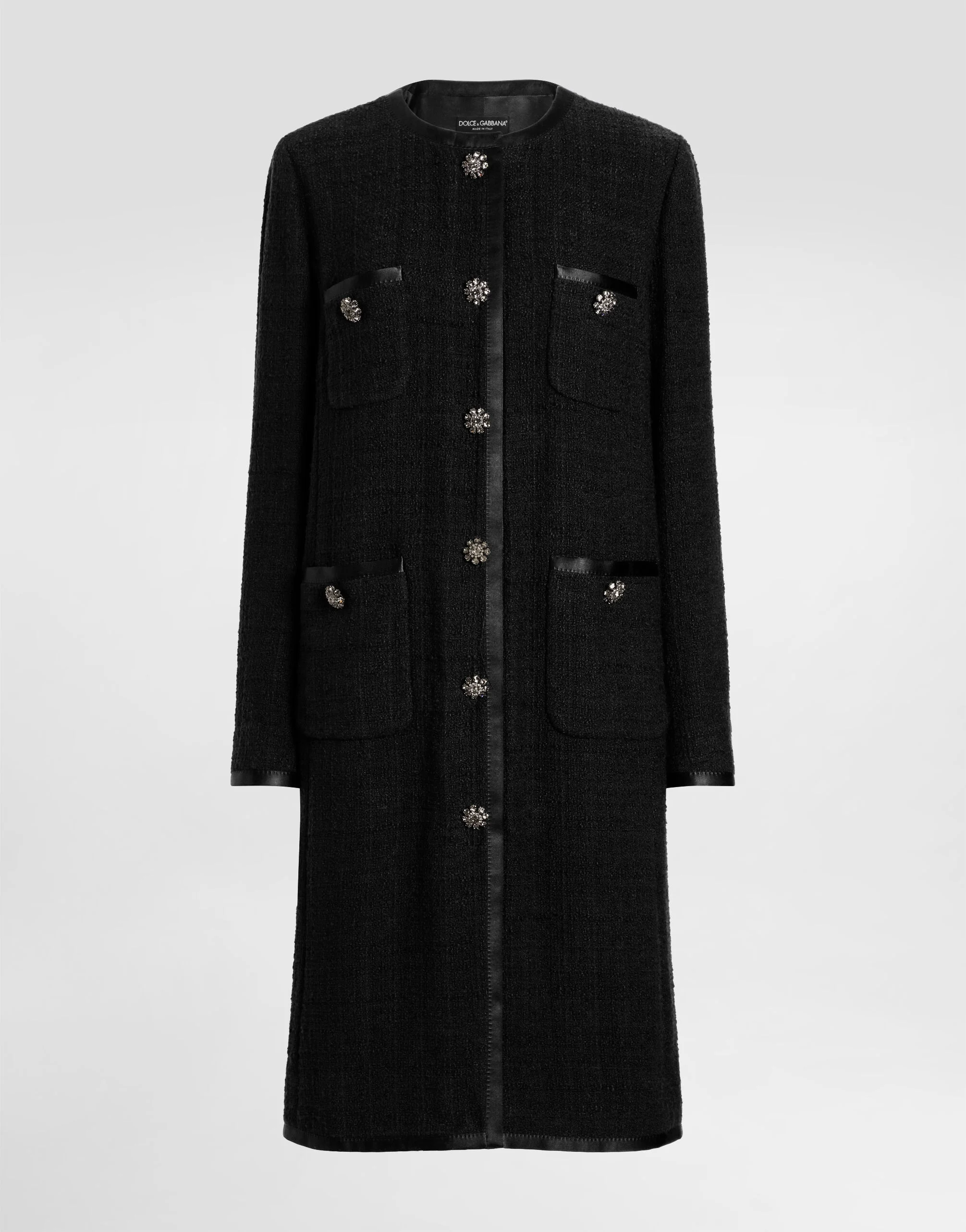 The Women's Black Sicily Collection reinforces Dolce&Gabbana's iconic fabrics and codes rooted in Italian heritage. Sensual silhouettes, highlighted by floral prints and refined corsetry, evoke an intriguing elegance, while the iconic black lace, satin, and velvet dominate the collection. Denim in various shades of blue introduces a contemporary twist, balancing the classic and modern. Embroidered crosses, medals, and jewelry add a sophisticated touch. Single-breasted raschel tweed coat with bejeweled rhinestone buttons: • Black • Round neck • Long sleeves • Pockets • Stretch silk satin lining • Faux rhinestone buttons • Press-stud fastenings • The piece measures 102 cm from the center back on a size IT 40 • The model is 175 cm tall and wears a size IT 40 • Made in Italy External composition: 81% Cotton 9% Viscose 8% Silk 2% Polyester Internal composition: 92% Silk 08% Spandex