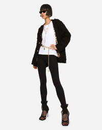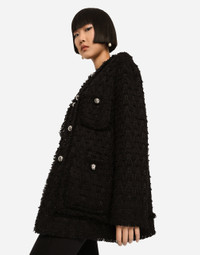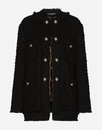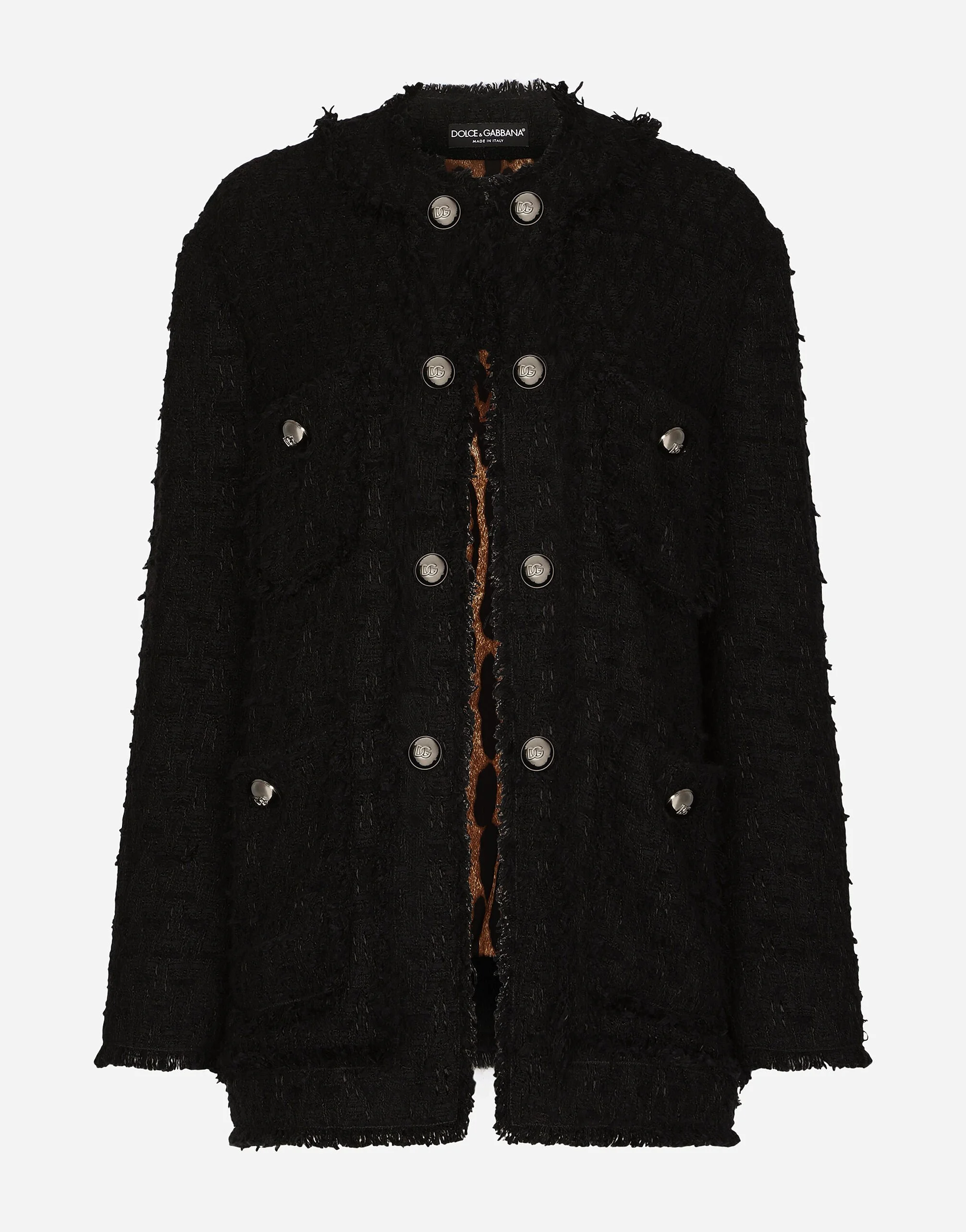 Single-breasted rush-stitch jacket: • Round neck • Long sleeves • Patch pockets with metal button with the DG logo • Leopard-print stretch satin lining • Inner press-stud fastenings and decorative half-sphere with DG logo on the exterior • The piece measures 72 cm from the rear collar seam on a size IT 40 • The model is 175 cm tall and wears a size IT 40 • Made in Italy Care And Details External composition: 67% Cotton 28% Viscose 4% Linen 1% Polyamide Internal composition: 97% Polyester 3% Spandex
