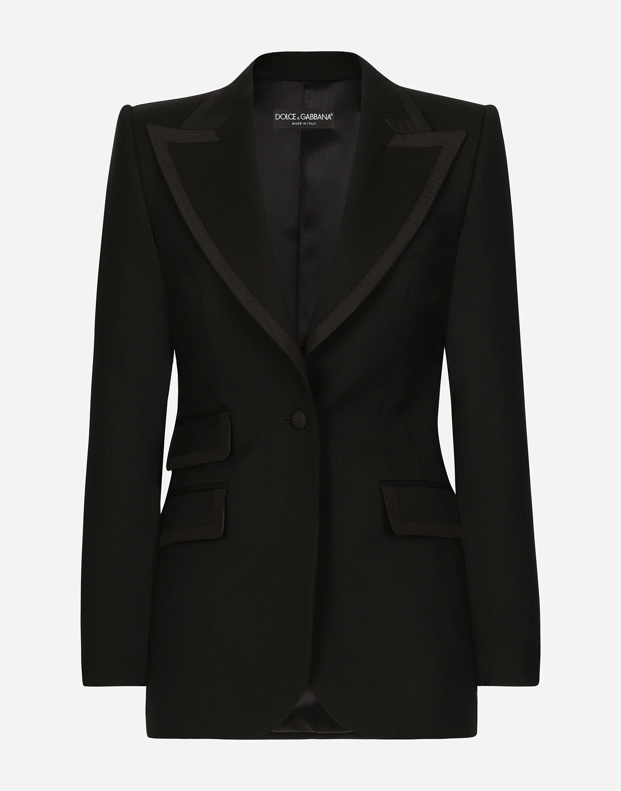 The DNA collection is distinguished by timeless shapes, bringing together three concepts: Sicilian flair, tailoring and sensuality. Nero Sicilia black and optical white predominate and pair with colors that catapult us onto the island of Sicily and make us dream. The designers channel the timeless wardrobe made up of creations that are instantly unmistakable in their simplicity, presenting us with sophisticated beauty loaded with meaning and symbolism that transcends fashion. Single-breasted stretch wool twill Turlington tuxedo jacket: • Black • Silk satin peak lapels • Long sleeves • Silk satin flap pockets • Side slits • Stretch silk satin lining • Canneté-covered button fastenings and DG logo • The piece measures 70 cm from the rear collar seam on a size IT 40 • The model is 175 cm tall and wears a size IT 40 • Made in Italy External composition: 91% Virgin Wool 5% Silk 4% Spandex Internal composition: 92% Silk 8% Spandex