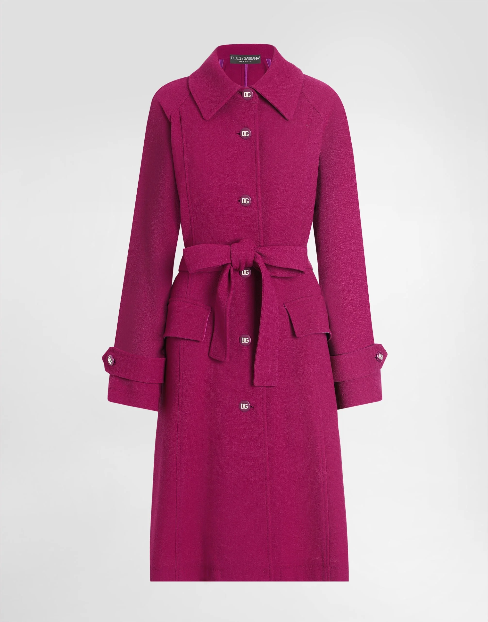 The Everyday Women's Collection reimagines contemporary daily wear with Dolce&Gabbana's signature style codes. Iconic fabrics mix with standout details like embroidered flowers, crystals, and jewel buttons, infusing elegance into every look. Gray animal print accented with green and purple, hyper-geometric jewelry, voluminous shapes and transparencies add unique touches. Men's tweed is reinvented with graphic twists, creating distinctive pieces that reflect refined sensuality. Single-breasted wool crepe trench coat with belt: • Purple • Shirt collar • Long raglan sleeves • Welt pockets with flap • Unlined • DG-branded button fastenings • The piece measures 105 cm from the center back on a size IT 40 • The model is 175 cm tall and wears a size IT 40 • Made in Italy External composition: 100% Wool
