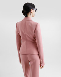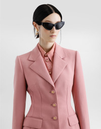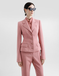 The Women’s DNA Collection is introducing a new side to femininity, which comes in shades of rose quartz, poised between sheerness and opacity, lightness and structure, formality and sensuality. Geometric Dolce Jackets, jacquard pajamas and floral brocade dresses intertwine with ultra-romantic designs. The DG print becomes an iconic statement, while Cordonetto lace and hints of Sicily Black embody the essence of a determined yet romantic femininity. Single-breasted wool crepe Dolce jacket: • Pink • Notched lapels • Long sleeves • Flap pockets • Silk satin lining • Cannete-covered button fastenings and DG logo • The piece measures 55 cm from the center back on a size IT 40 • The model is 175 cm tall and wears a size IT 40 • Made in Italy External composition: 100% Virgin Wool Internal composition: 100% Silk