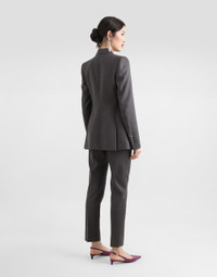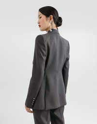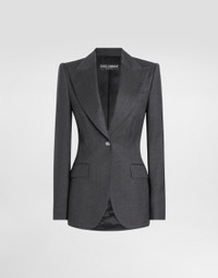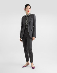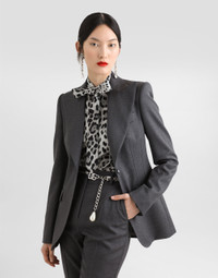 The Everyday Women's Collection reimagines contemporary daily wear with Dolce&Gabbana's signature style codes. Iconic fabrics mix with standout details like embroidered flowers, crystals, and jewel buttons, infusing elegance into every look. Gray animal print accented with green and purple, hyper-geometric jewelry, voluminous shapes and transparencies add unique touches. Men's tweed is reinvented with graphic twists, creating distinctive pieces that reflect refined sensuality. Single-breasted woolen Turlington blazer: • Gray • Peak lapels • Long sleeves • Welt pockets with flaps • Silk satin lining • DG-branded button fastenings • The piece measures 70 cm from the center back on a size IT 40 • The model is 175 cm tall and wears a size IT 40 • Made in Italy External composition: 100% Virgin Wool Internal composition: 100% Silk