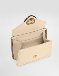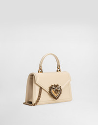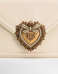 This small top-handle Devotion bag comes in calfskin. Feminine and versatile, it is distinguished by the exclusive bejeweled heart fastening and the shoulder strap inspired by the techniques of high-quality jewelers. Small calfskin Devotion top-handle bag: • Cream • Front flap with bejeweled branded heart made from hand-tooled metal alloy with pearl inlay • Concealed magnetic fastening and customized heart • Top handle and detachable chain strap • Calfskin interior with flat pocket • Packaging matches the item • Measurements: H13 x W19 x D4.5 cm • Made in Italy External composition: 100% Calfskin Internal composition: 100% Calfskin
