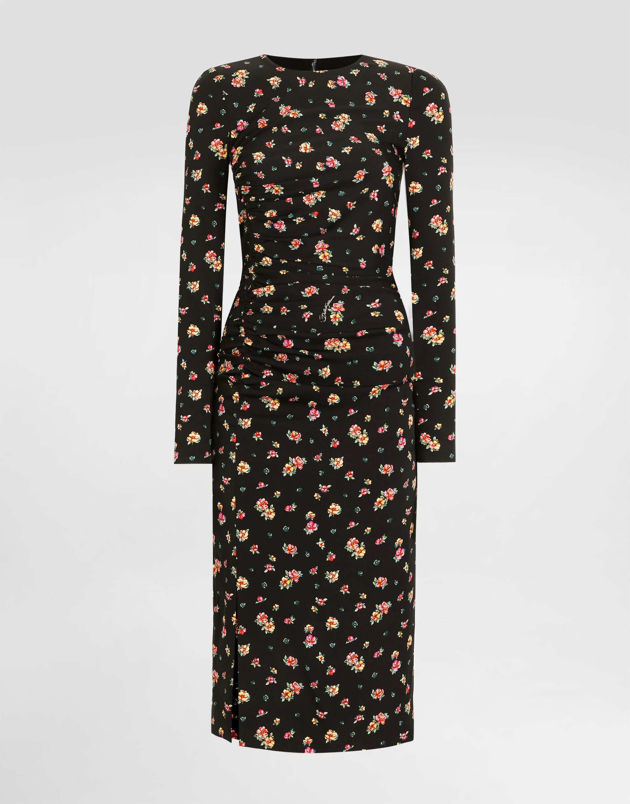 This charmeuse dress is an elegant example of artisanal tailoring. With a sophisticated design and draped details, it is perfect for special occasions, enhancing femininity with a touch of exclusivity thanks to the unique print. Small floral-print charmeuse dress: • Multi-colored • Crew neck • Radial drapery • Wide slit • Long fitted sleeves with pleats • Zip closure at the back • The model is 175 cm tall and wears size 40 IT • Made in Italy The difference in the print placement that you may find on this product is a feature of Dolce&Gabbana’s “Handmade” pieces. A detail that makes every garment or accessory unique and exclusive. External Composition: 94% Silk, 6% Elastane Internal Composition: 91% Silk, 9% Elastane