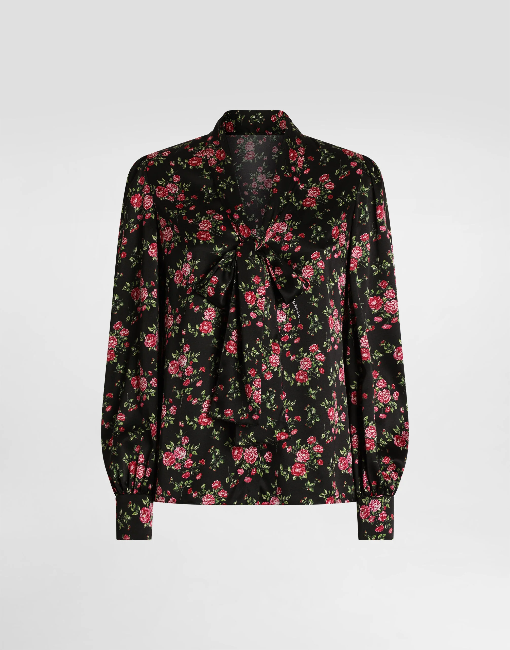 This elegant shirt stands out for its refined design and feminine details, perfect for adding a touch of class to your wardrobe. Small rose bouquet-print satin shirt: • Multi-colored • V-neck with scarf collar and bow at the front • Hem with gathered cuff • Long sleeves with slight curl at the ridge • Center back length 65 cm on size 40 IT • The model is 175 cm tall and wears size 40 IT • Made in Italy The difference in the print placement that you may find on this product is a feature of Dolce&Gabbana’s “Handmade” pieces. A detail that makes every garment or accessory unique and exclusive. External Composition: 93% Silk, 7% Elastane