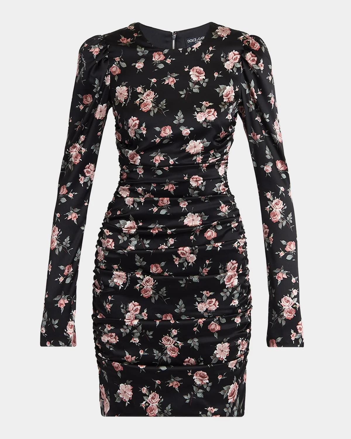 Express sensuality and elegance with this Dolce & amp;Gabbana satin dress, patterned with a small rose bouquet print. Round neckline Long sleeves Hem falls above the knee Sheath silhouette Invisible back zip closure Silk/elastane Dry clean Made in Italy
