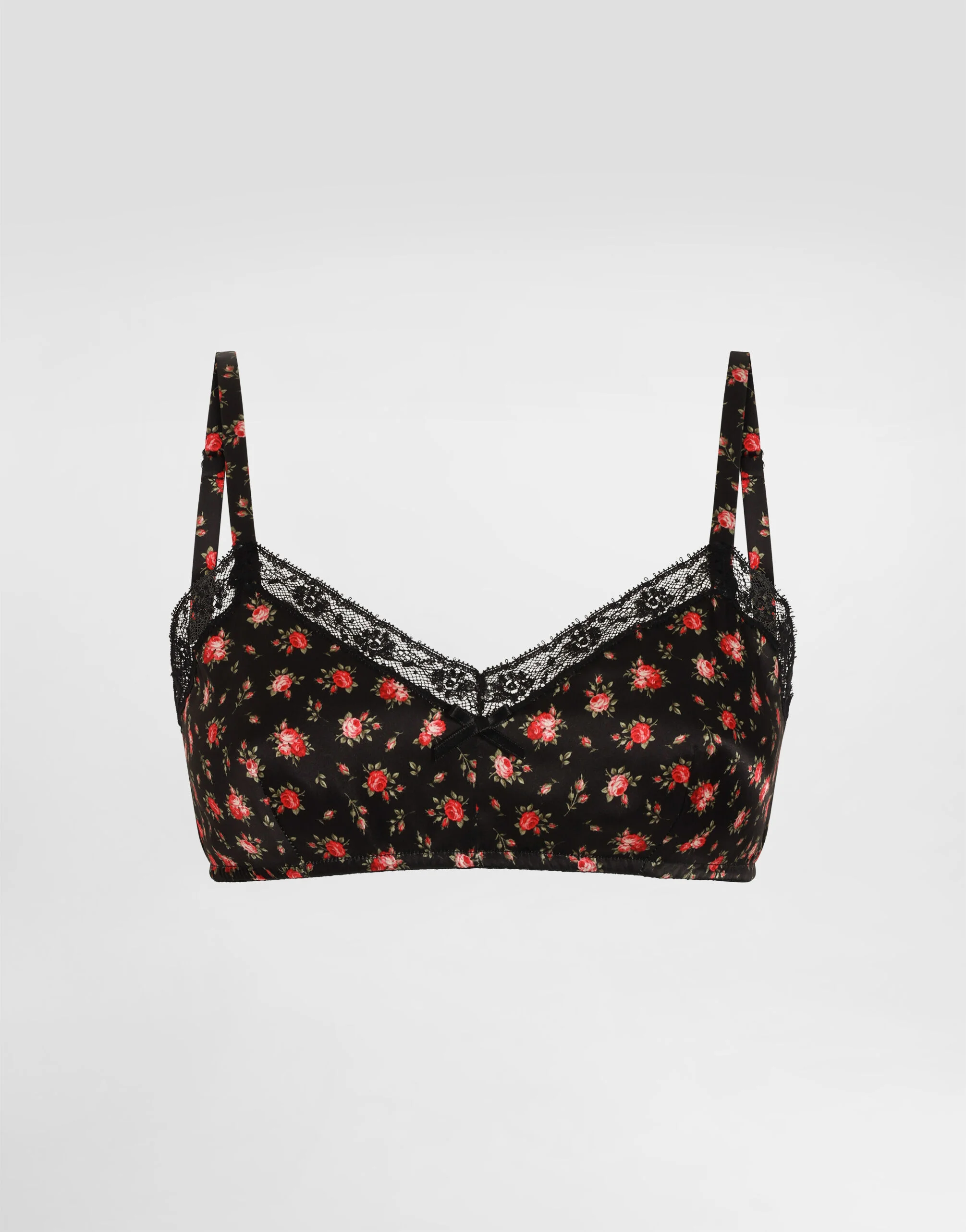This non-wired bra is the perfect combination of comfort and style, ideal for those looking for an elegant and unique underwear. Small rose-print satin and lace bra: • Multi-colored • Unwired • Single satin layer • Adjustable full shoulder straps • Lace at the neckline • Satin bow on front • Vertical pleat pattern • Elasticated underbust • Hook and eye closure • Made in Italy The difference in the print placement that you may find on this product is a feature of Dolce&Gabbana’s “Handmade” pieces. A detail that makes every garment or accessory unique and exclusive. External Composition: 100% Silk