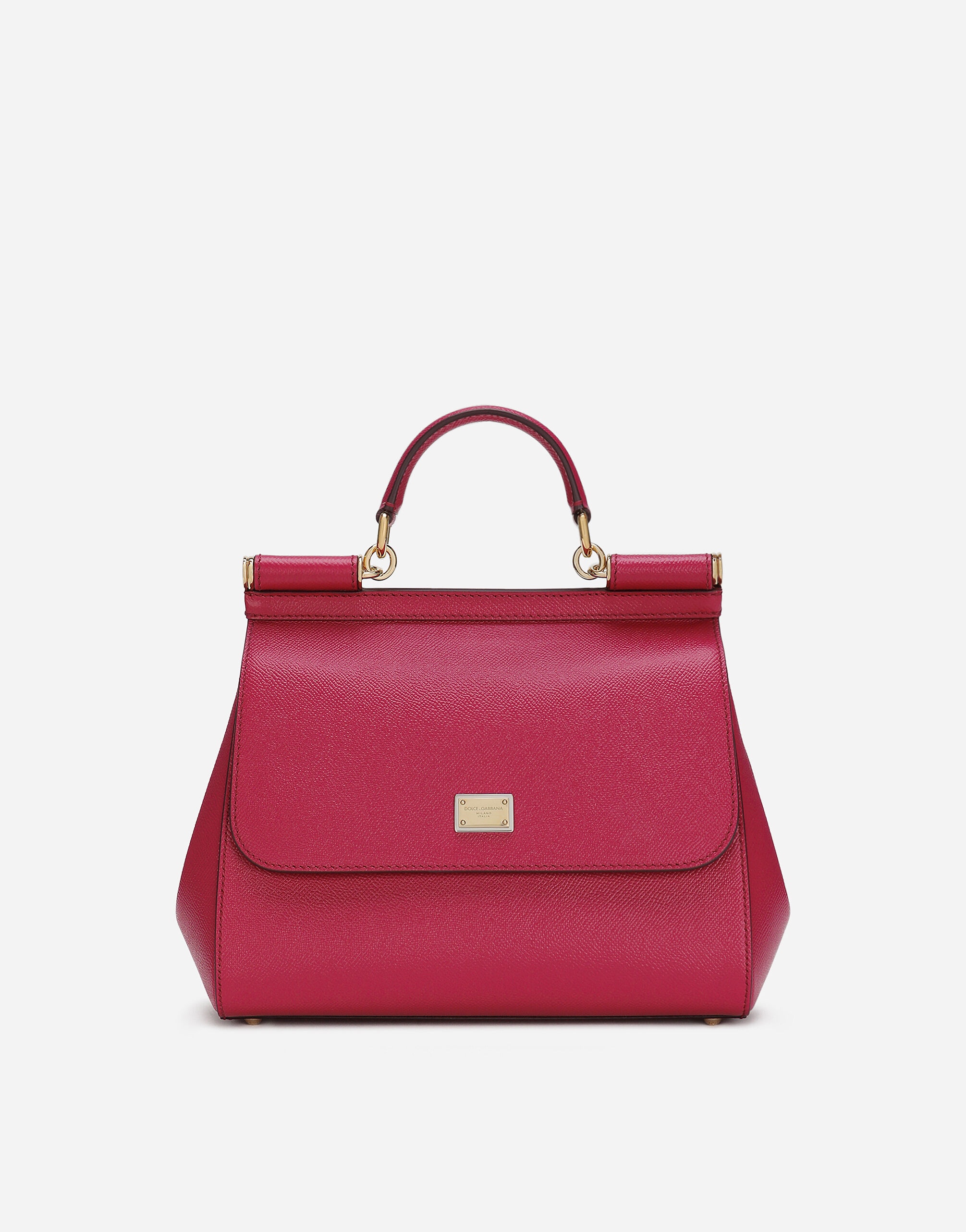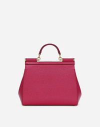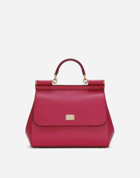 The brand icon par excellence, this large Sicily bag comes in Dauphine calfskin. Understated and feminine, it comes with the logo tag featuring two metal plating finishes. Large Sicily bag in Dauphine calfskin: • Fuchsia • Front flap with hidden double magnetic fastening • Logo tag featuring two metal plating finishes • Top handle and adjustable, detachable strap in Dauphine calfskin • Printed fabric lining • Inner pocket with branded zipper and a cell phone holder • Metal feet studs on the base • Item comes with a branded dust bag • Measurements: H22 x W25 x D12 cm • Made in Italy External composition: 100% Calfskin Internal composition: 80% Cotton 20% Calfskin