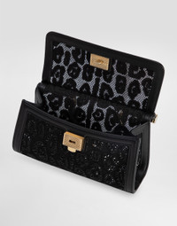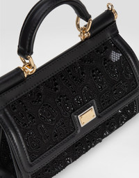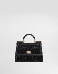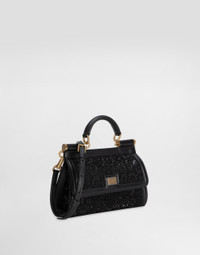 The brand icon par excellence, this small Sicily bag comes in plonge calfskin. Understated and feminine, it features rhinestone embellishment and the branded tag with two metal plating finishes. Small Sicily bag in plonge calfskin: • Black • Front flap with hidden double magnetic fastening • Branded logo tag featuring two metal plating finishes • Top handle and adjustable, detachable strap in plonge calfskin • Fabric lining • Item comes with a branded dust bag • Measurements: H13 x W19 x D6 cm • Made in Italy External composition: 65% Polyester 20% Calfskin 15% Polyamide Internal composition: 100% Calfskin