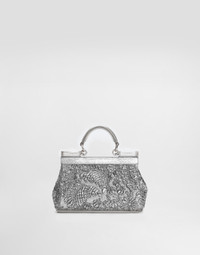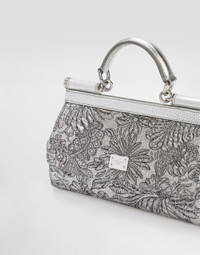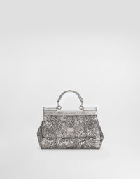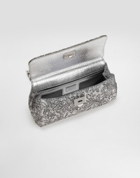 Elegance, tailored lines and sparkling details define the Dolce&Gabbana Holiday collection. Sixties inspirations blend with a contemporary aesthetic. For him, structured jackets and cuts that enhance the silhouette for her, silver brocade and crystals illuminate festive looks. Each piece stands out for its fine materials, attention to detail and distinctive style. The Sicily handbag, made with the refined brocade textile, is an elegant and versatile accessory for any occasion. Small Sicily handbag in brocade: • Silver • Leather handles and removable and adjustable shoulder strap • Tuck-in closure • Palladium plating • External customization with monogalvanic plate • Internal customization with stamp with film • Interior with flat pocket • Item equipped with a logo bag and a pre-assembled box • Measurements: H13 x L19 x D6 cm • Can hold keys, card holder and phone. • Made in Italy External composition: 27% Metallic Polyester, 27% Acrylic, 20% Calfskin, 12% Virgin Wool, 10% Silk, 4% Polyamide Internal composition: 50% Calfskin, 34% Viscose, 16% Silk