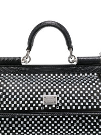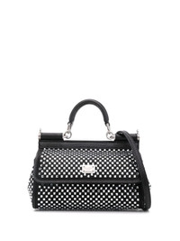 small Sicily tote bag Highlights - Black - Leather trim - Foldover top with magnetic fastening - Single top handle - Adjustable detachable shoulder strap - Crystal embellishment - Silver-tone logo plaque - Main compartment - Internal slip pocket Made in Italy Composition Outer: Viscose 60%, Silk 30%, Calf Leather 10% Calf Leather 100% SIZE & FIT Model measurements Height 5 ft 10 in(1.78 m) Bust/Chest 33.07 in(84 cm) Hips 36.61 in(93 cm) Waist 24.8 in(63 cm) Measurement DEPTH 2.36 in(6 cm) HANDLE 2.75 in(7 cm) HEIGHT 4.33 in(11 cm) STRAP 46.85 in(119 cm) WIDTH 7.87 in(20 cm)