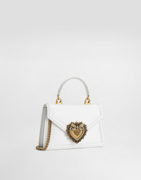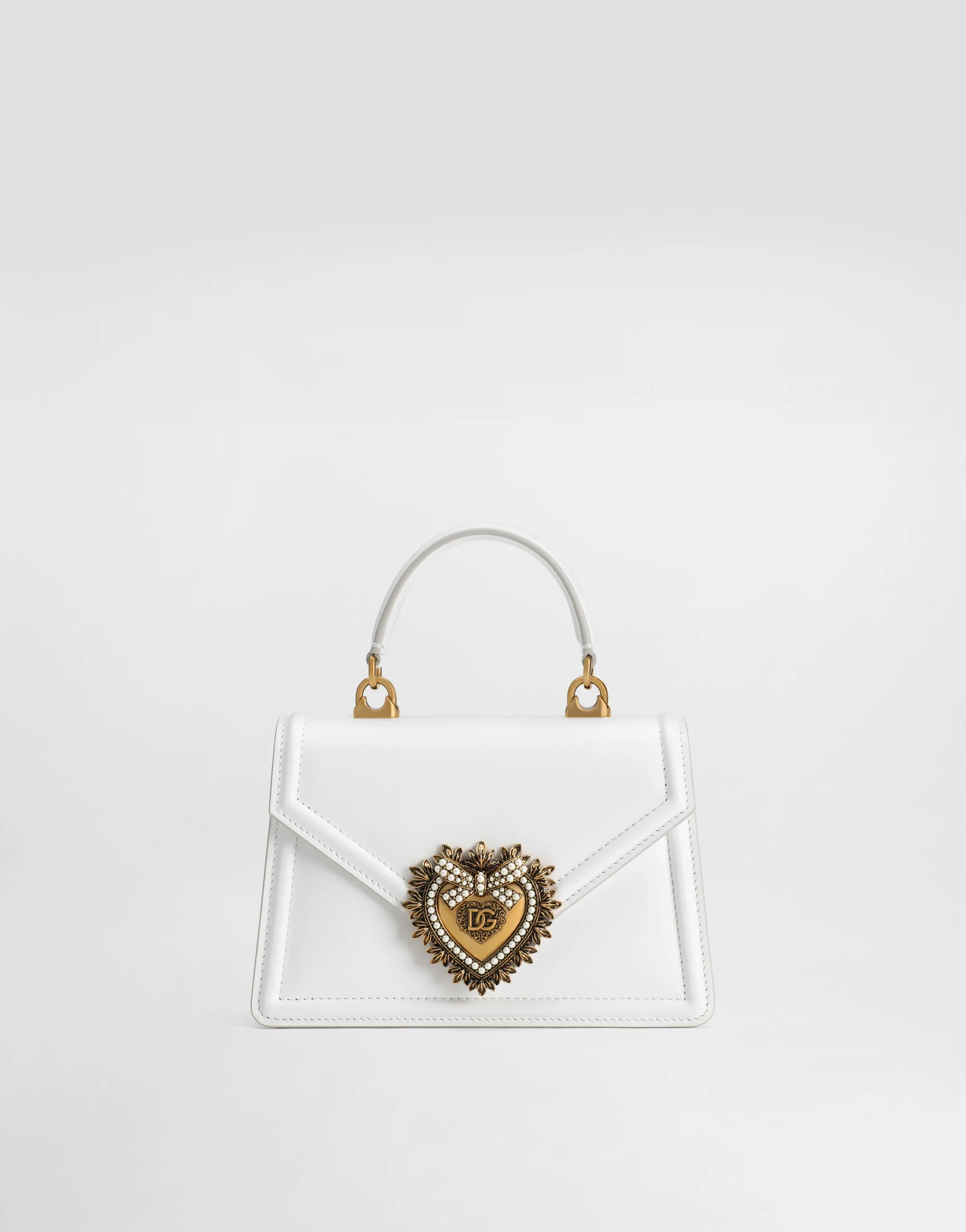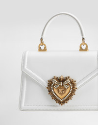 The small top handle bag from the Devotion line is made of fine calfskin and characterized by the exclusive bejeweled heart closure and strap inspired by the manufacture of fine jewelry: • On top handle and removable strap • Front flap with handmade bejeweled and logoed heart made of metal alloy with pearl inlays • Hidden magnetic closure with personalized heart • Internal calfskin structure with flat pocket • Item equipped with Dust Bag and dedicated packaging • Measurement: 19 x 13 x 4.5 cm - 7.5 x 5.1 x 1.7 inches •Made in Italy Care And Details External Composition: 100% Calfskin Internal Composition: 100% Calfskin