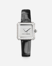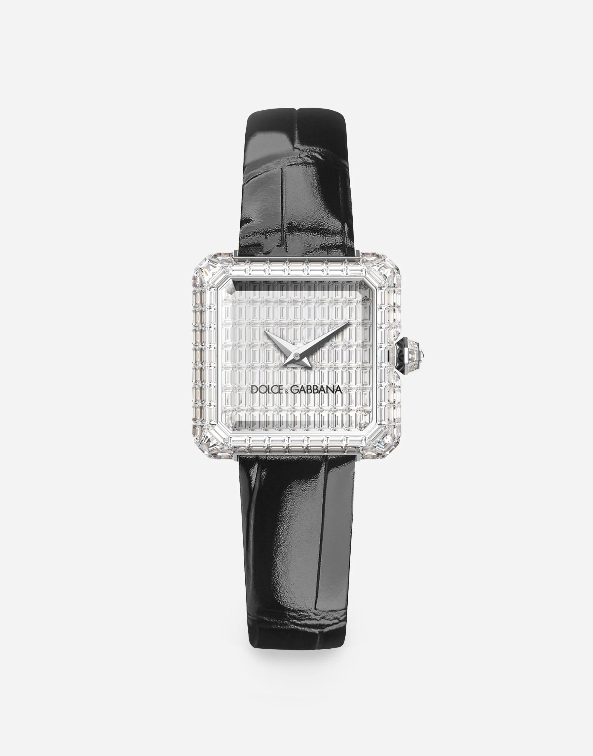 Sofia Invisible Setting watch in 18 kt white gold and alligator strap Function Hours and minutes display Technical specifications 18kt white gold Black alligator strap Gemstones Movement Electronic quartz movement powered by a 1.5 V battery Caliber: ETA 901.001 Swiss Made Dimensions: 13 x 15.15 mm Quartz frequency: 32,768 Hz Number of rubies: 3 Case 168 colorless diamonds, rectangular and trapezoidal, baguette cut: 4.47 ct Color range: D–F Clarity range: Flawless–VVS Dial 76 colorless diamonds, rectangular, baguette cut: 2.98 ct Color range: D–F Clarity range: Flawless–VVS Crown 8 colorless diamonds, trapezoidal, baguette cut: 0.11 ct Color range: D–F Clarity range: Flawless–VVS 1 colorless diamond, round, red cut: 0.04 ct Color range: D–F Clarity range: Flawless–VVS Closure: deployant clasp 38 colorless, rectangular, baguette-cut diamonds: 0.89 ct Color range: D–F Clarity range: Flawless–VVS 18 kt white gold POST-SALE WATCH MAINTENANCE To preserve the shine of the watch and metal bracelet, it is recommended to use neutral soap and rinse thoroughly with fresh, lukewarm water. Then dry with a soft cloth. The same procedure is recommended after swimming in the sea or pool. Avoid direct contact with solvents, detergents, perfumes, and cosmetic products, as they may damage the case, seals, bracelet, and/or strap. Protect the watch from drops and impacts, as they could not only seriously damage the finish but also compromise the mechanical functions, water resistance, and accuracy. After adjustments, it is recommended to always push the crown firmly against the case to prevent water or dust from entering the mechanism. The watch is water resistant up to 3 BAR/3 ATM. This means it has been tested under underwater pressure equivalent to a depth of 20 meters. The watch should never be used for sports involving a high risk of impact (such as surfing, water skiing, etc.). Leather straps are not suitable for activities involving water. When the watch is wet, do not pull out the crown, as water could enter the case. Temperatures above 60°C/140°F and below -10°C/14°F , sudden changes in pressure, density and temperature, magnetic fields, and many other factors can affect the accuracy of the watch, we recommended to avoid placing the watch next to objects which could generate strong magnetic fields, such as loudspeakers and electric motors. If you note any irregularities in operation, the watch should be taken to an authorised Dolce&Gabbana retailer.