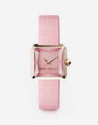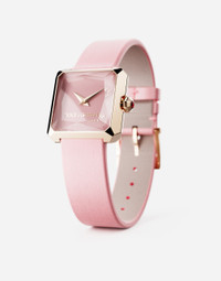 Watch from the SOFIA line with 100% pure pink silk satin strap. • Indication of hours and minutes • Material. 18 Kt pink gold • Size. 24 x 24 mm • Glass. “sapphire” glass with geometrical facets arranged in a symmetric way in order to create highly original light reflections • Bottom clasp. with four side screws and safety closure • Crown. 18 Kt pink gold set with 1 natural ruby • Water resistance . 3BAR/3ATM • Dial. pale blue enamelled, without markers with pink gold plated logo at 6 o’clock • Hands. pink gold plated, “sword shaped” • Electronic quartz movement powered by a 1.5 V, 3 years life battery . • Calibre. ETA E01.001 Swiss Made • Size. 11 mm diameter, h 2.5 mm • Frequency of the quartz. 32,768 Hz • Number of rubies. 3 • Clasp. pin buckle in 18 Kt pink gold Add your personal touch to this item such as your initials or a customized message. Send the request to CustomerServiceJewelleryWatches@dolcegabbana.it. If the item has been customized then it cannot be returned. Material: Red 18 kt Gold POST-SELLING WATCHES MAINTENANCE To maintain the sheen of the watch and metal bracelet, we recommend using mild soap and rinsing thoroughly with warm water. Dry with a soft cloth. We recommend this being done also after a swim in the sea or pool. It is advisable to avoid direct contact with solvents, detergents, perfumes and cosmetic products, which might damage the case, seals, bracelet and/or strap. It is advisable to protect the watch from falls and shocks, which could not only seriously damage the finish, but might affect the mechanical functions also, as well as the water resistance and accuracy of the watch. Temperatures above 60° C and below -10° C , sudden changes in pressure, density and temperature, magnetic fields, and many other factors can affect the accuracy of the watch. If you note any irregularities in operation, the watch should be taken to an authorised Dolce&Gabbana retailer. The Dolce&Gabbana watch is a high-precision timepiece. Despite the care watchmakers have dedicated to making it, the influence of magnetic fields, sudden temperature change and even the lifestyle of the wearer may result in minor irregularities. To ensure optimal operation, it is recommended that a comprehensive inspection be effected every three or four years. The owners of the watch can benefit from a global network of Dolce&Gabbana retailers, which alone are authorised to carry out operations on the watch. In the same way, for the electronic quartz movement, it is recommended that the battery be replaced by an authorised Dolce&Gabbana retailer, which will at the same time check the proper functioning and water resistance of the watch. During maintenance, the battery and any electrical parts are collected and disposed of in accordance with current regulations.