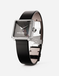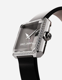 Sofia steel watch with colorless diamonds Functions • Indication of hours and minutes • Case • Material. 316L steel • Size. 24 x 24 mm • Glass. “sapphire” glass with geometrical facets • Bottom clasp. with four side screws and safety closure • Crown. 316L steel set with 1 rose cut black diamond • Gemstones. 57 colourless diamonds 0.38 ct approximately, quality range. colour D-G, clarity VS-SI. • Water resistance . 3BAR/3ATM Dial • in mother of pearl, without markers with applied logo at 6 o’clock • Hands. pink gold plated, sword shaped • Movement • Electronic quartz movement powered by • a 1.5 V, 3 years life battery . • Calibre. ETA E01.001 Swiss Made • Size. 11 mm diameter, h 2.5 mm • Frequency of the quartz. 32,768 Hz • Number of rubies. 3 • Strap. pure silk satin, black • Clasp. 316L steel closure Swiss Made 316L Steel POST-SELLING WATCHES MAINTENANCE To maintain the sheen of the watch and metal bracelet, we recommend using mild soap and rinsing thoroughly with warm water. Dry with a soft cloth. We recommend this being done also after a swim in the sea or pool. It is advisable to avoid direct contact with solvents, detergents, perfumes and cosmetic products, which might damage the case, seals, bracelet and/or strap. It is advisable to protect the watch from falls and shocks, which could not only seriously damage the finish, but might affect the mechanical functions also, as well as the water resistance and accuracy of the watch. Temperatures above 60° C and below -10° C , sudden changes in pressure, density and temperature, magnetic fields, and many other factors can affect the accuracy of the watch. If you note any irregularities in operation, the watch should be taken to an authorised Dolce&Gabbana retailer. The Dolce&Gabbana watch is a high-precision timepiece. Despite the care watchmakers have dedicated to making it, the influence of magnetic fields, sudden temperature change and even the lifestyle of the wearer may result in minor irregularities. To ensure optimal operation, it is recommended that a comprehensive inspection be effected every three or four years. The owners of the watch can benefit from a global network of Dolce&Gabbana retailers, which alone are authorised to carry out operations on the watch. In the same way, for the electronic quartz movement, it is recommended that the battery be replaced by an authorised Dolce&Gabbana retailer, which will at the same time check the proper functioning and water resistance of the watch. During maintenance, the battery and any electrical parts are collected and disposed of in accordance with current regulations.