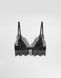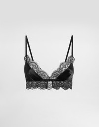 In the “WOMAN SS 24” Collection, the imagery of old Sicily interacts with the masculine, with sensual shapes, lace, nude tones and delicate overlays, to create pieces that move amid clean silhouettes, the elegance of the 1960s, the contrasts of black and white and luxurious textures. The designers are reworking their signature style and their iconic Sicilia black color to convey an aware, seductive and confident Sicilian WOMAN who is imbued with sensuality. Silk satin soft-cup bralette with lace details: • Black • Lace inserts on the neckline and trims • Adjustable silk straps • Adjustable hook-and-eye fastening on the center back • Made in Italy External composition: 50% Silk 28% Polyamide 22% Viscose
