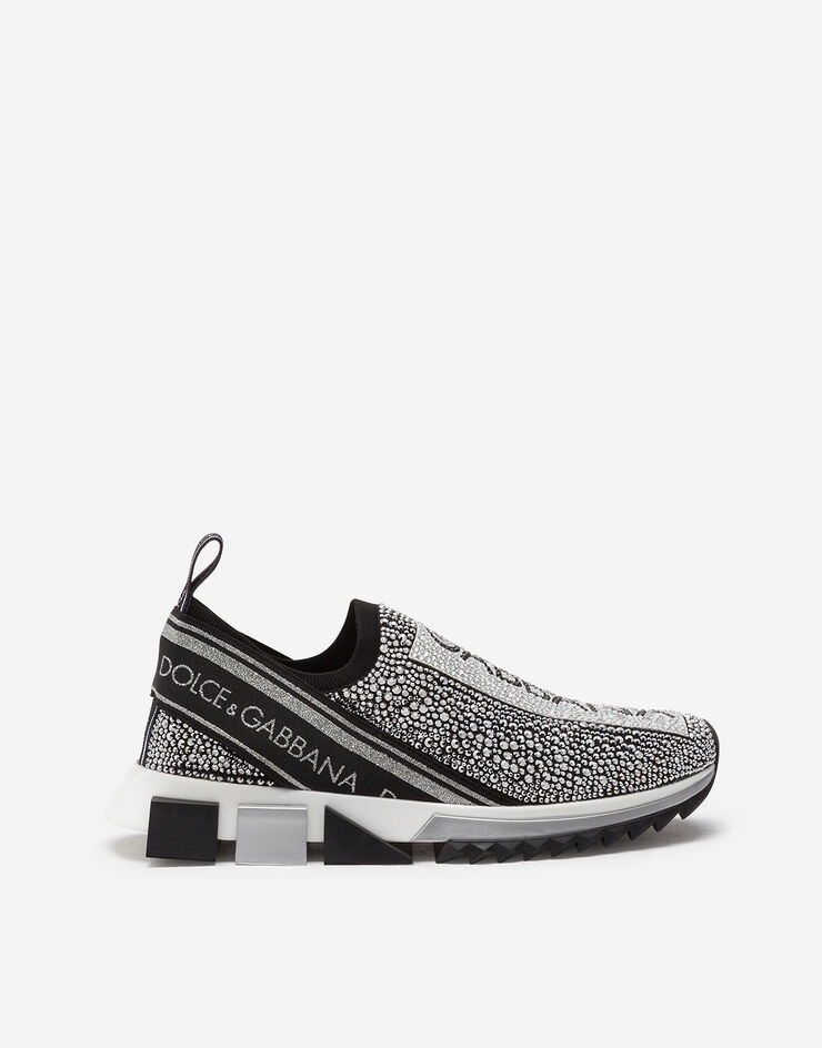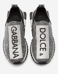The iconic Sorrento slip-on sneakers in logotape-print stretch mesh with fusible crystals in the shape of a sock and a geometric sole come covered in sparkle in this unique and precious version. Differently sized crystals are applied and recreate the logotape design flawlessly, which is also created with rhinestones: • Printed stretch mesh upper with fusible crystal appliqués • Branded, stretch tape on the back • Leather footbed with branded label • Two-tone micro sole • Extra-light rubber bottom assembly • Item comes with themed packaging • Made in Italy • Small fit: we recommend choosing a larger size. Care And Details Composition: 70% Polyester 15% Nylon 15% Rayon