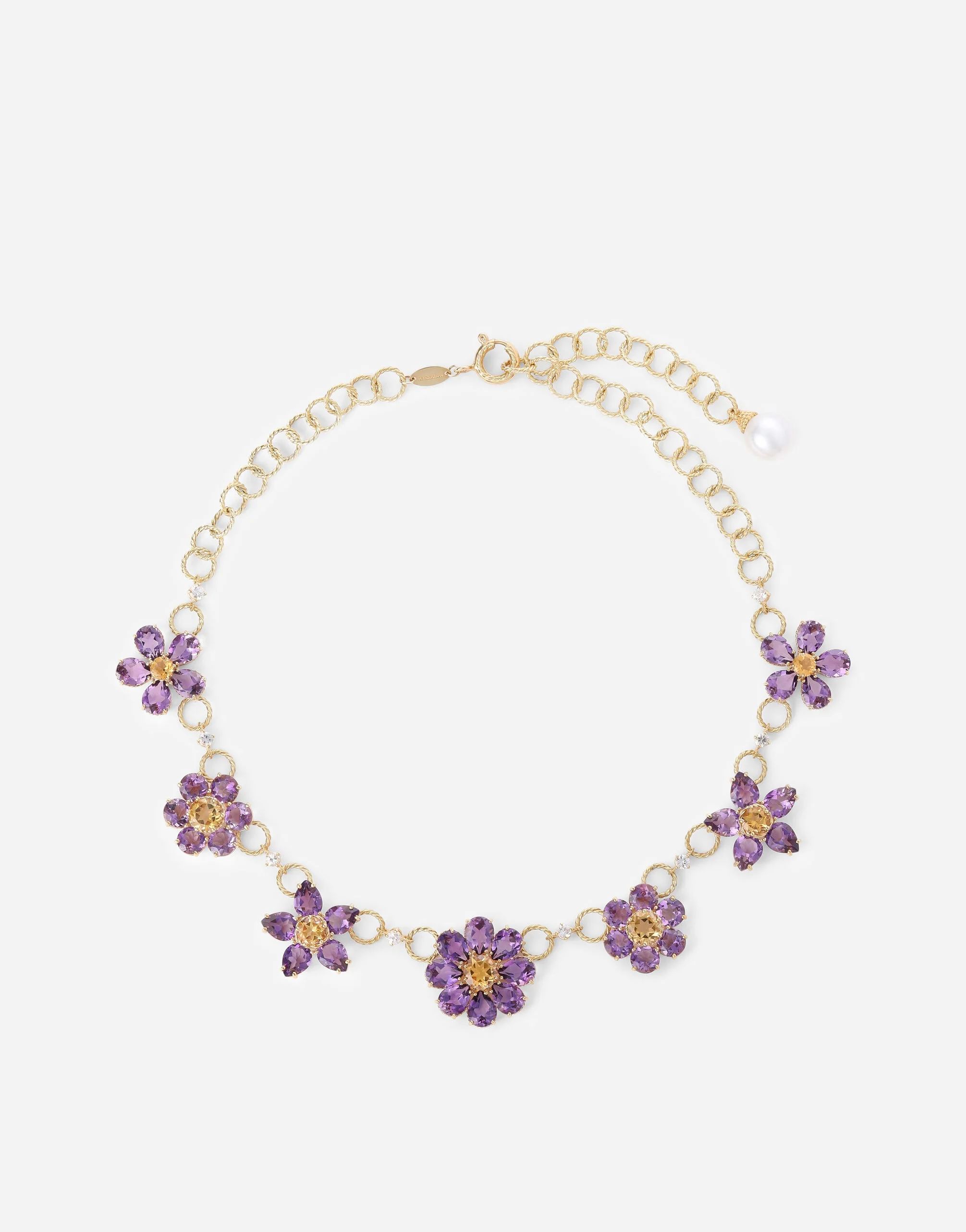 Necklace formed by a series of rings in yellow twisted gold wire. Each of these elements is formed by different gemstones, in settings decorated with floral motifs and twisted gold wire. A pearl serves as the terminal for the adjustment chain and an oval tag with the DOLCE&GABBANA logo is placed beside the closure. • •Technical specifications. •Gold 18 Kt. •Length. 43 cm adjustable. •Gemstones. 40 round and drop-shaped amethysts, quartz variety, 7 round citrines, quartz variety, 8 colourless round sapphires, 1 baroque South Sea pearl. •Made in Italy. Yellow 18 kt gold