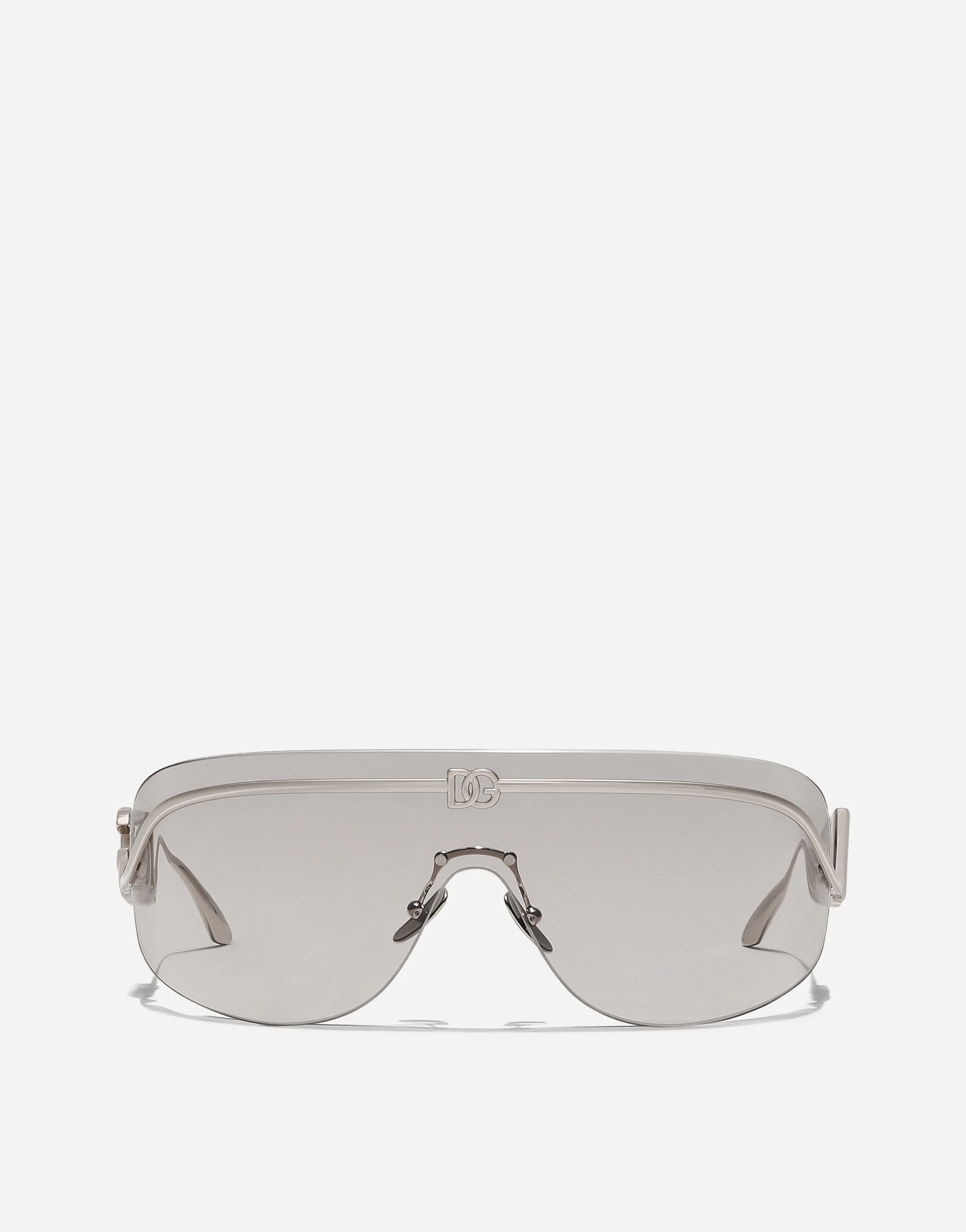 Shield design characterized by modern elegance and refined details. A sleek metal insert on the front creates a continuous connection with the temples where the DG crossed logo is perfectly integrated. • Silver metal frame • Gold metal temples • Grey mirror silver lenses • 100% UV protection • Size lens - bridge - temple: 40 - 115 mm • Fitting: Adjustable nosepads • Packaging: Institutional • Made in Italy
