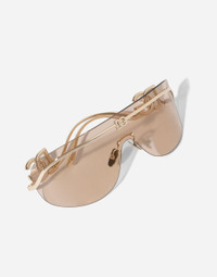 Shield design characterized by modern elegance and refined details. A sleek metal insert on the front creates a continuous connection with the temples where the DG crossed logo is perfectly integrated. • Gold metal frame • Gold metal temples • Light brown lenses • 100% UV protection • Size lens - bridge - temple: 40 - 115 mm • Fitting: Adjustable nosepads • Packaging: Institutional • Made in Italy