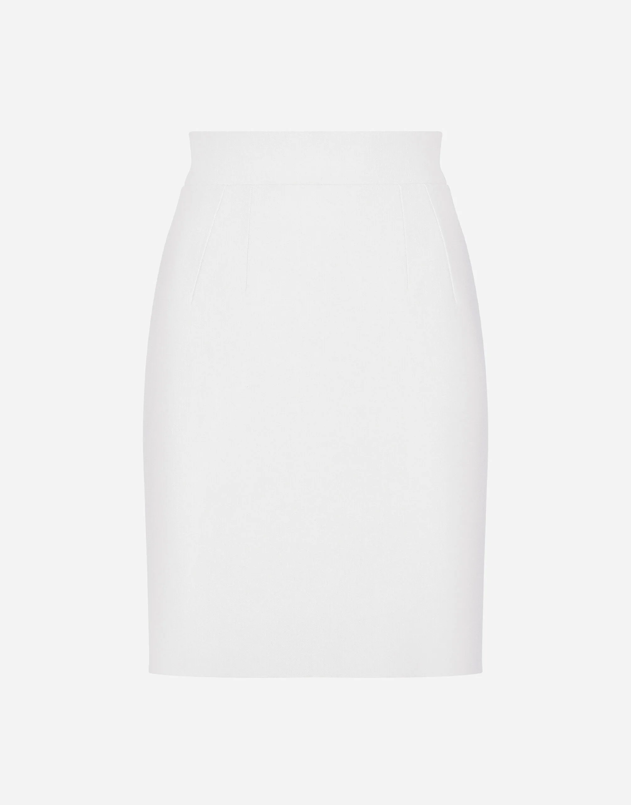 The DNA collection is distinguished by timeless shapes, bringing together three concepts: Sicilian flair, tailoring and sensuality. Nero Sicilia black and optical white predominate and pair with colors that catapult us onto the island of Sicily and make us dream. The designers channel the timeless wardrobe made up of creations that are instantly unmistakable in their simplicity, presenting us with sophisticated beauty loaded with meaning and symbolism that transcends fashion. Straight-cut stretch wool midi skirt: • White • High-waisted • Tonal stretch silk satin lining • Rear zipper and hook-and-eye fastening • The piece measures 55 cm from the waist down on a size IT 40 • The model is 175 cm tall and wears a size IT 40 • Made in Italy External composition: 98% Virgin Wool 2% Spandex Internal composition: 92% Silk 8% Spandex