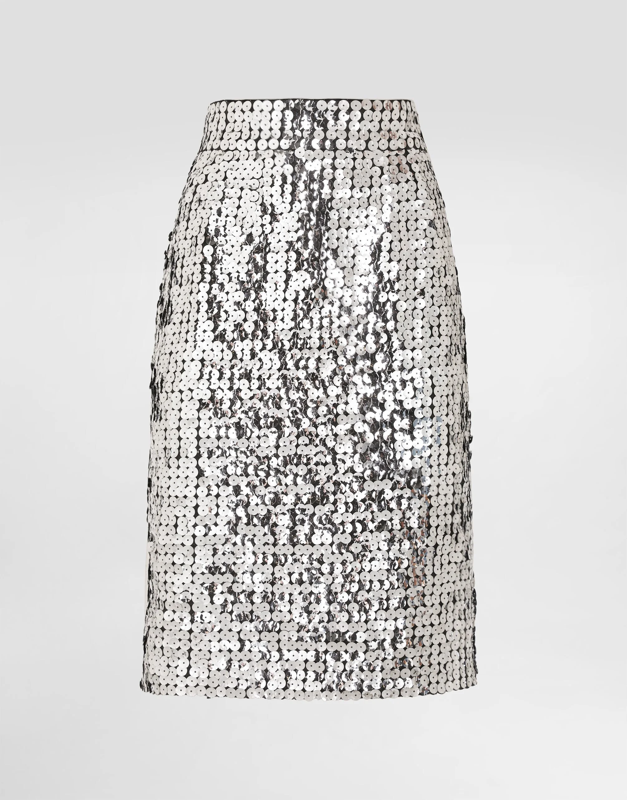 Elegance, tailored lines and sparkling details define the Dolce&Gabbana Holiday collection. Sixties inspirations blend with a contemporary aesthetic. For him, structured jackets and cuts that enhance the silhouette for her, silver brocade and crystals illuminate festive looks. Each piece stands out for its fine materials, attention to detail and distinctive style. This sequined straight skirt is an iconic piece that adds a touch of glamour and sophistication to any outfit. Perfect for an elegant evening or a special event, its clean line and careful details make it a unique piece in every woman's wardrobe. Straight skirt with sequins: • Silver • With high belt • Slit at the center back • Covered zip closure at the center back • Lined • Length is 60 cm on size 40 IT • Made in Italy External composition: 100% Polyester Internal composition: 92% Silk, 8% Elastane
