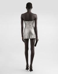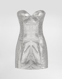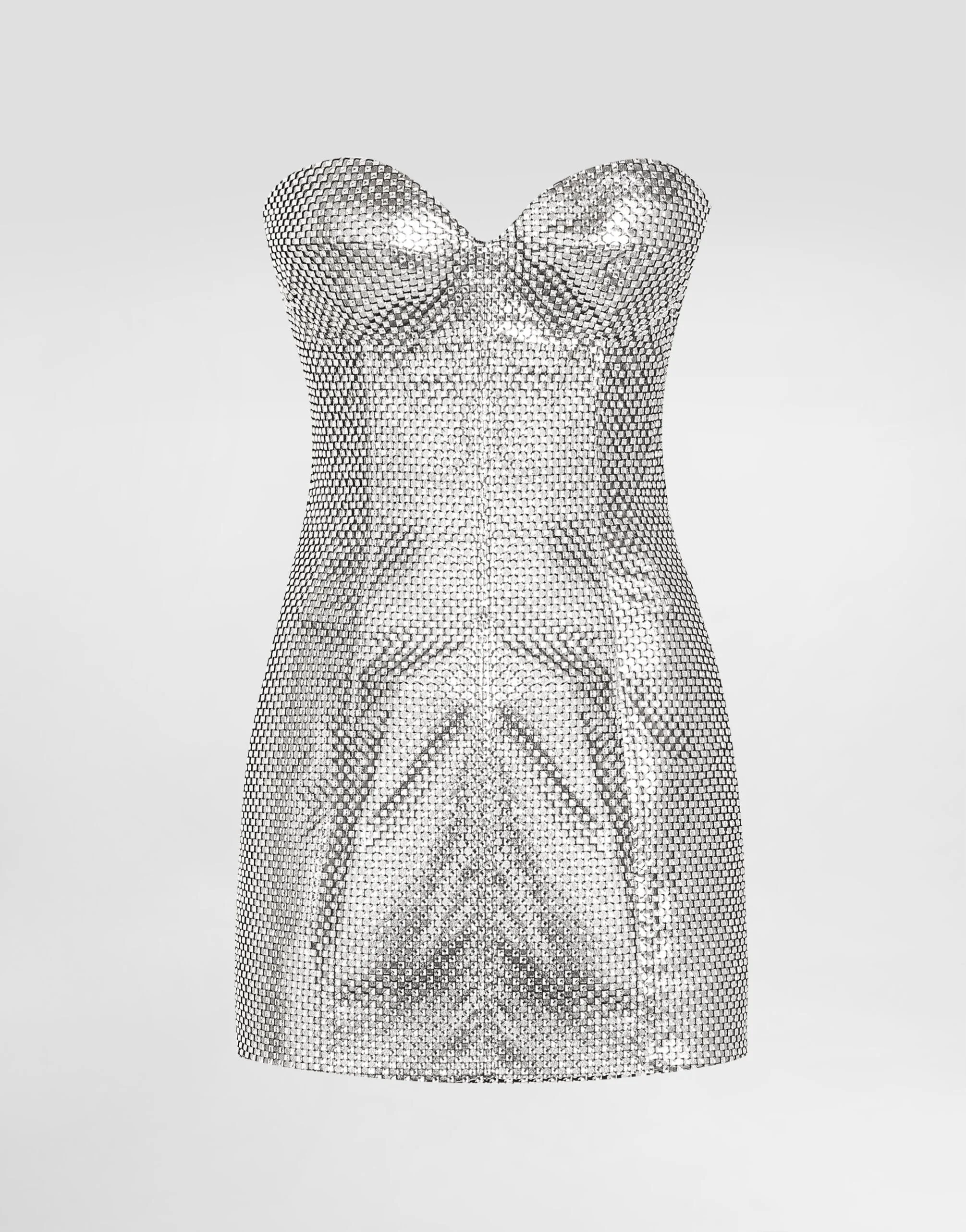 In the Fall/Winter 2025 Fashion Show Collection, shearling jackets, in fur-free versions, reveal slip dresses and create contrast' plays while denim welcomes fabric or Leo print inserts. Sweatshirts are the result of long experimentation with volumes. Evening looks become precious thanks to dresses with special embroideries and luminous touches of sequins and crystals. Sheepskin inserts also unite hats, shoes, and bags, including those with pockets. This strapless dress is an example of sophisticated elegance, perfect for special occasions. The innovative design and the use of fine materials make it a unique garment that enhances the female silhouette with a touch of glamour. Strapless mesh dress: • Silver • Internal base with cups • Concealed back zip • Waist length 40 cm on size 40 IT • The model is 175 cm tall and wears size 40 IT • Made in Italy External Composition: 97% Polyester, 3% Elastane Internal Composition: 92% Silk, 8% Elastane