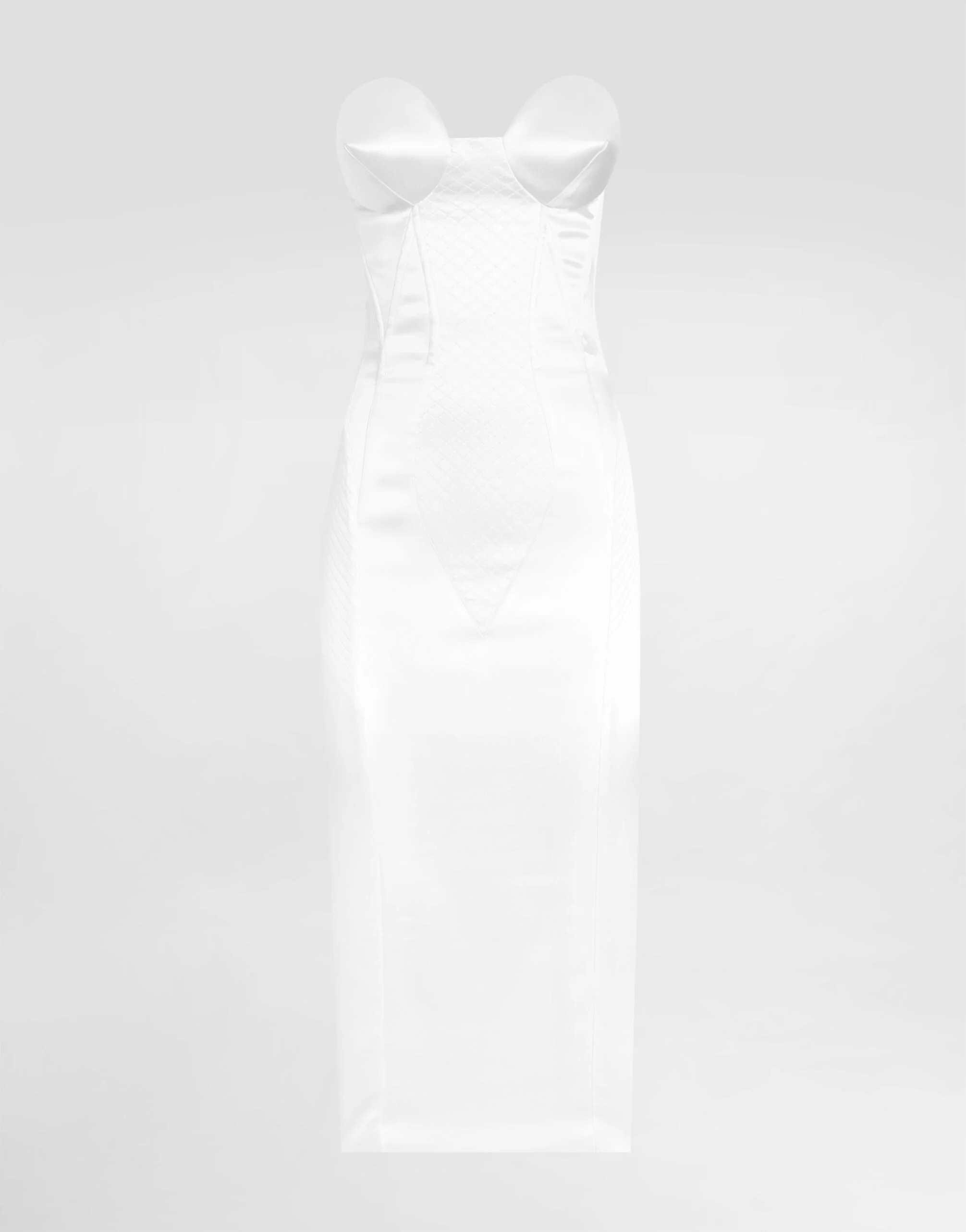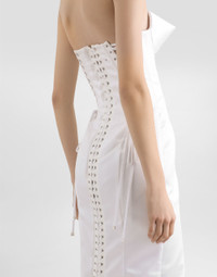 The Spring/Summer 2025 Women’s Collection is celebrating Italian beauty through bold and charismatic femininity. The 50s-inspired lingerie is the star, intermingling with fitted dresses, corsets and oversize trench coats. The iconic jackets have been updated with cropped cuts and modern inserts, while the floral prints add a romantic edge. The eveningwear shines with light fabrics and crystals, accompanied by look-defining accessories, from iconic bags to the cross earrings. Strapless stretch silk satin dress with corset details: • White • Sweetheart neck with conical cups • Sleeveless • Stretch silk satin lining • Rear zipper and hook-and-bar fastening • The piece measures 75 cm from the waist down on a size IT 40 • The model is 175 cm tall and wears a size IT 40 • Made in Italy External composition: 65% Acetate 29% Polyamide 06% Spandex Internal composition: 92% Silk 08% Spandex
