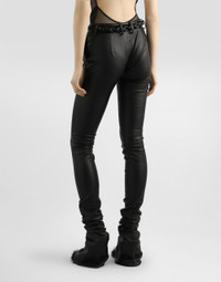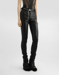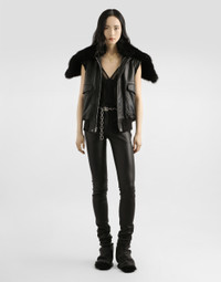 In the Fall/Winter 2025 Fashion Show Collection, shearling jackets, in fur-free versions, reveal slip dresses and create contrast' plays while denim welcomes fabric or Leo print inserts. Sweatshirts are the result of long experimentation with volumes. Evening looks become precious thanks to dresses with special embroideries and luminous touches of sequins and crystals. Sheepskin inserts also unite hats, shoes, and bags, including those with pockets. These stretch nappa leather trousers are perfect for those looking for a sleek and modern style. Made from high-quality materials, they offer a snug fit and sophisticated design. Stretch nappa leather trousers: • Black • Slim fit • Low waist • Front with a pleat waist and French pockets • Back no pockets, only waist darts • 4 cm high belt with belt loops • The model is 175 cm tall and wears size 40 IT • Made in Italy External Composition: 100% Lambskin
