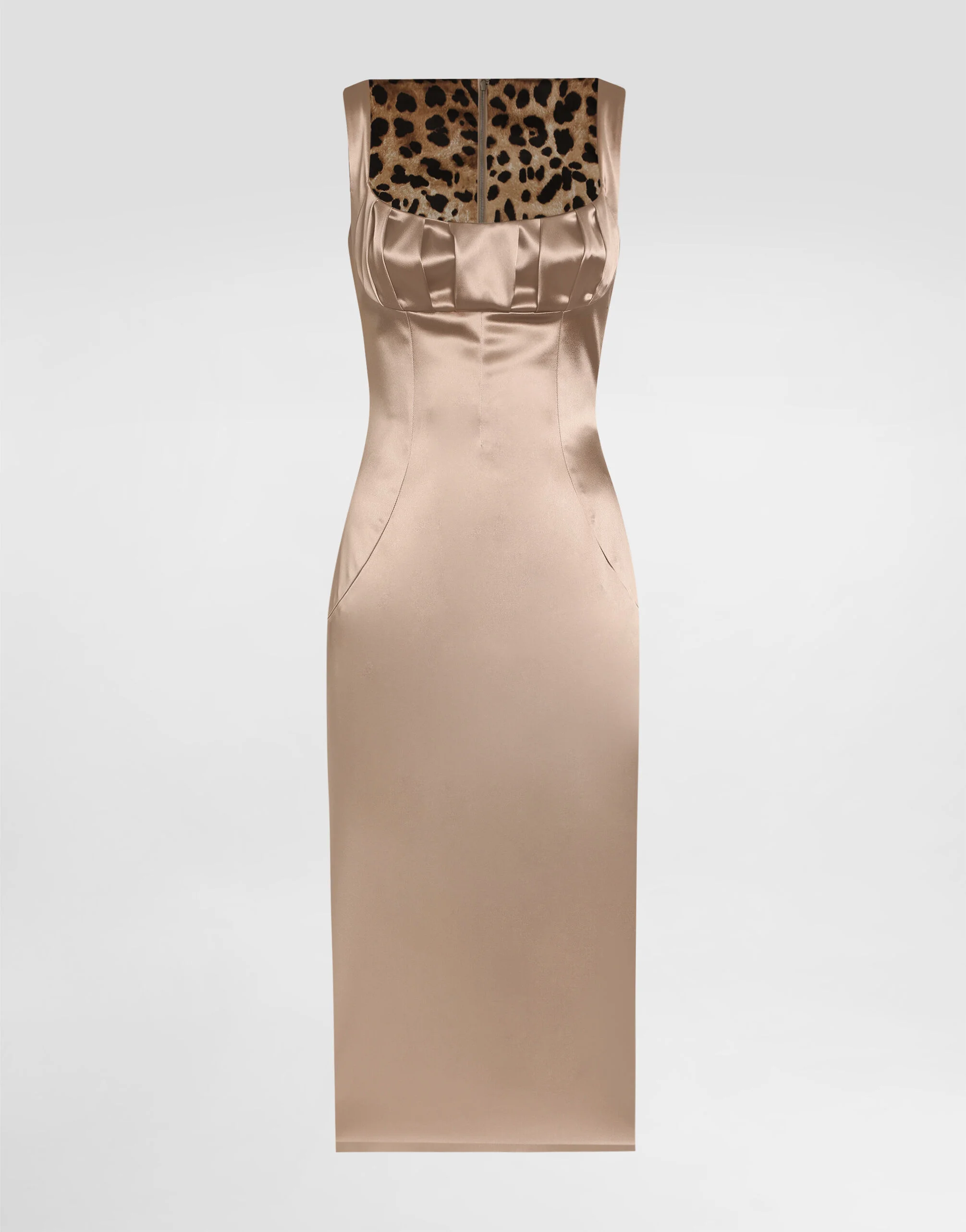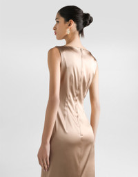 This stretch satin midi dress is the perfect choice for an elegant occasion. With a sophisticated design and refined details, it is the epitome of modern femininity. Stretch satin midi dress: • Beige • Narrow shoulder vest • Round cup cut and single central cup with pleated motif • Skirt with open slit • Zip at the center back • Lined • Length 75 cm from waist on size 40 IT • The model is 175 cm tall and wears size 40 IT • Made in Italy External Composition: 65% Acetate, 29% Polyamide, 6% Elastane Internal Composition: 93% Silk, 7% Elastane