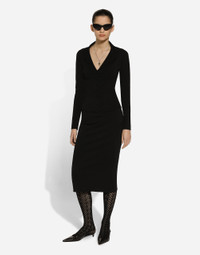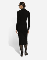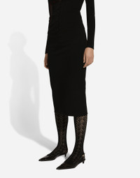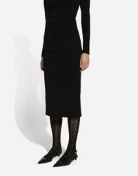 Inspired by 80s fashion photography, the Black Sicily collection masterfully blends masculine and feminine elements, pairing tailored cuts and corset details for the FW 24/25 season. A new vision of the iconic Nero Sicilia black is conveyed through contemporary and sensual looks: jackets and skirts in all-over glen plaid pair with openwork socks, while the 50s-inspired Mun shoes with Eva heel go with the houndstooth Sicily bag featuring crocodile-print leather inserts. Stretch viscose knit pencil skirt with DG logo: • Black • 14-gauge knit • Dense hand • Unlined • Metal DG logo • Rear zipper and hook-and-eye fastening • The piece measures 80 cm from the waist down on a size IT 40 • The model is 175 cm tall and wears a size IT 40 • Made in Italy External composition: 71% Viscose 15% Polyester 8% Polyamide 6% Spandex