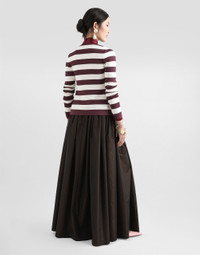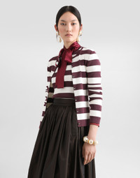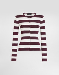The Everyday Women's Collection reimagines contemporary daily wear with Dolce&Gabbana's signature style codes. Iconic fabrics mix with standout details like embroidered flowers, crystals, and jewel buttons, infusing elegance into every look. Gray animal print accented with green and purple, hyper-geometric jewelry, voluminous shapes and transparencies add unique touches. Men's tweed is reinvented with graphic twists, creating distinctive pieces that reflect refined sensuality. Striped crew-neck viscose cardigan: • Multi-colored • 18-gauge knit • Round neck • Long sleeves • Dense hand • Tubular neck and hem • Form fitting • Button fastenings • The piece measures 56 cm from the shoulder seam on a size IT 40 • The model is 175 cm tall and wears a size IT 40 • Made in Italy External composition: 97% Viscose 02% Polyamide 01% Spandex