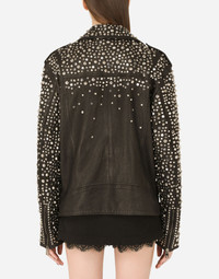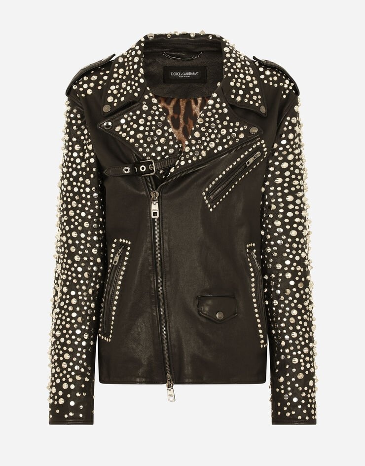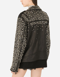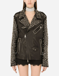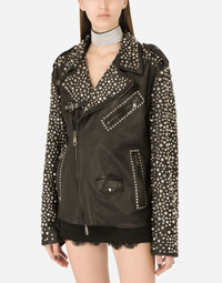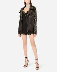 In this collection Dolce&Gabbana is rewriting the rules of fashion, women and modernity and infusing it with joy and optimism, creatively merging textures, colors and styles in a modern way and drawing inspiration from the 2000s. Even the classic biker jacket has turned unique and fine. Adorned with studs on the collar and sleeves, it will add a bold, original feel to all your looks: • Shirt collar • Long sleeves with zipper • Zipped pockets • Leopard-print stretch satin lining • Diagonal zipper fastening on the side • The piece measures 62 cm from the rear collar seam on a size IT 40 • The model is 175 cm tall and wears a size IT 40 • Made in Italy Care And Details External composition: 100% Goatskin