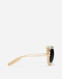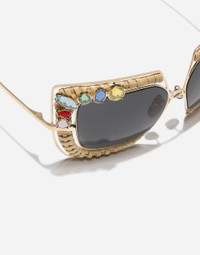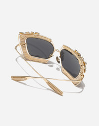 This sunglass is a unique piece made from a unique wicker weave, crafted and finished by hand to enhance its natural texture. Shiny gold metal details and stones set on the weave create an ultra-feminine diva look. • Gold metal and wicker frame • Gold metal temples • Dark grey lenses • 100% UV protection • Size bridge - temple- lenses: 14 - 135 - x • Fitting: Adjustable nosepads • Packaging: Institutional • Made in Italy