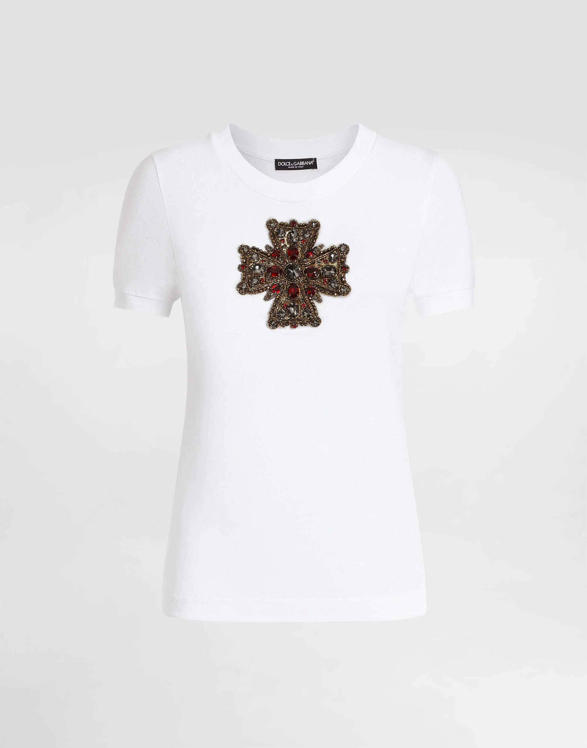This t-shirt is a versatile and sophisticated piece that is ideal for adding a touch of elegance to your everyday wardrobe. Its Swarovski cross application offers a unique and precious detail, perfect for those looking for style and quality. T-shirt with Swarovski cross application: • White • Crew neck • Short sleeves • Length from shoulder point 60.5 cm on size 40 IT • The model is 175 cm tall and wears size 40 IT • Made in Italy External Composition: 100% Cotton