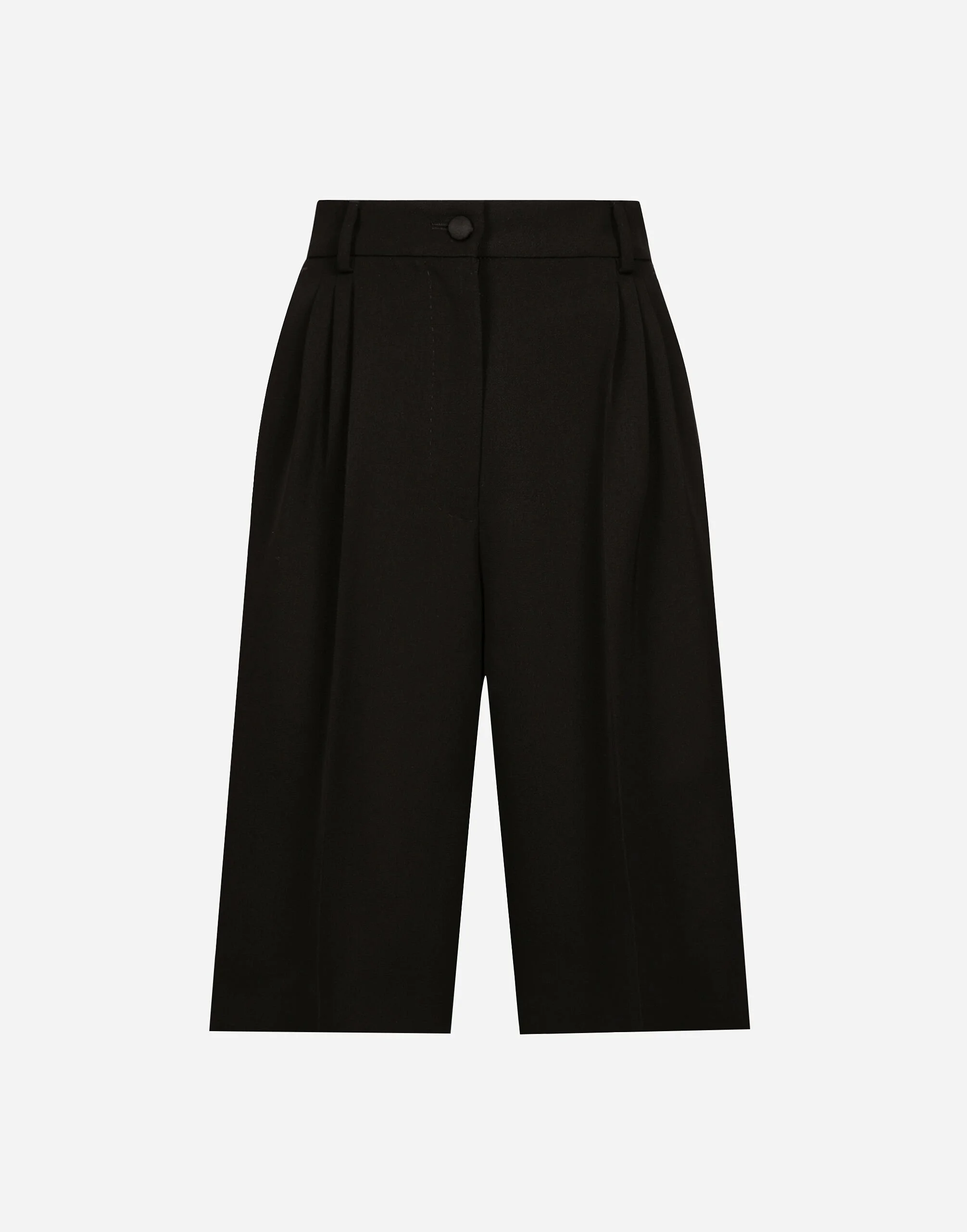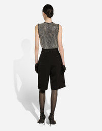 Menswear and womenswear mix and mingle, influencing one another and creating tailoring that embraces endless nuances, from the boldest to the most sophisticated, to define the rules of eternally classy femininity. A monochrome retelling in Nero Sicilia black, embellished by golden touches and rhinestones, adorning clean lines and incorporating stylish fabrics such as velvet, chiffon, lace, organza, and unique mesh details, the expression of authentic beauty for dresses, shirts and accessories. Wool gabardine tuxedo Bermuda shorts: • Black • High-waisted • Double darts • Front slant pockets • Welt back pockets • Inner leg: 30 cm • Hem: 31 cm • Zipper and button fastening • The model is 175 cm tall and wears a size IT 40 • Made in Italy External composition: 89% Virgin Wool 09% Silk 02% Polyester