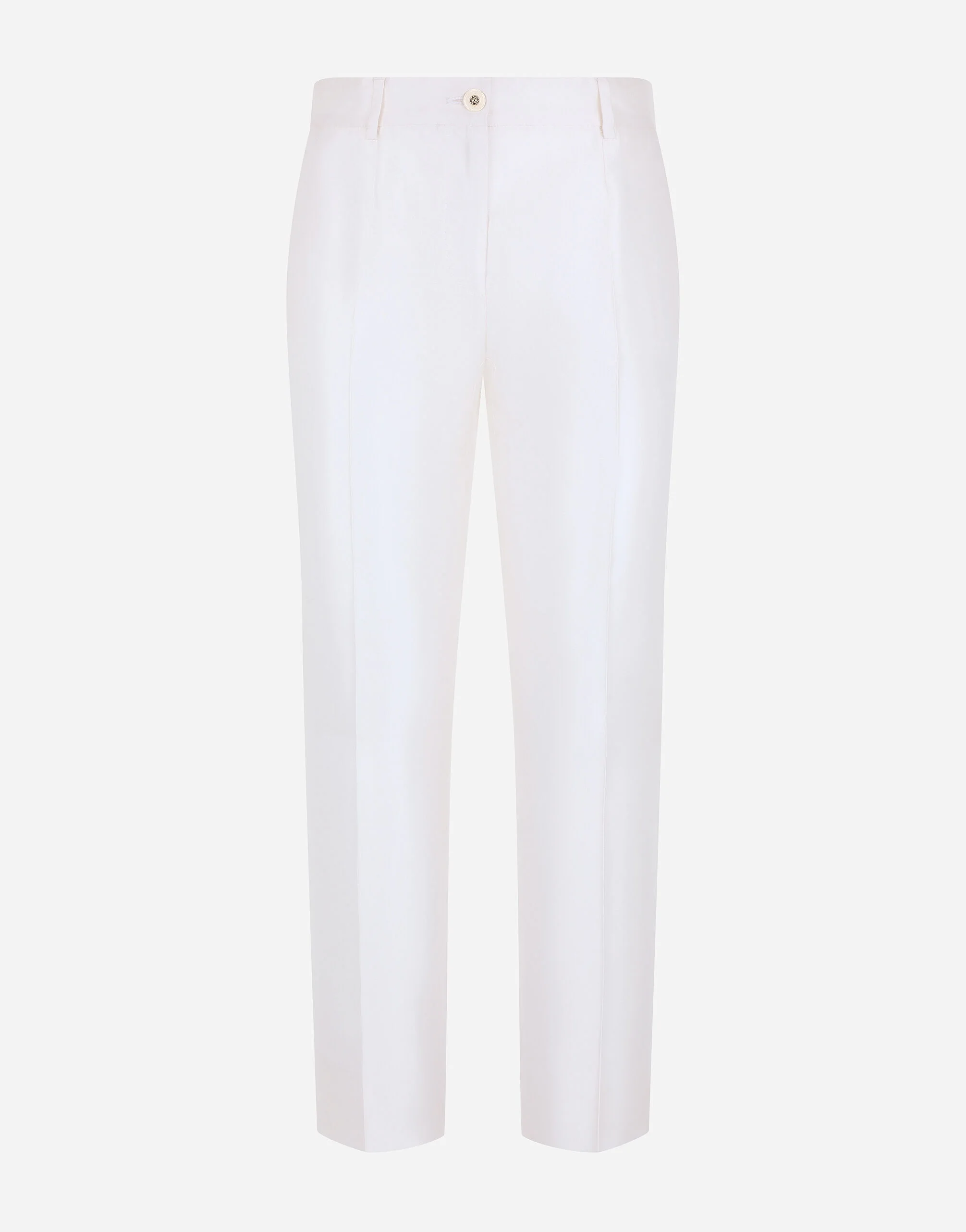 The Flowering Collection has us dreaming of faraway destinations, the most exclusive ones in the world, inviting us through the colors and the yellow rose print to take refuge in warm and unique places. Light White, lemon yellow, polka-dot accents and the various shades of leaf green for vibrant and ultra-feminine pieces where the keyword is tailoring. Every look invites us to savor and dream every moment of our free time, to discover beauty and enhance our femininity. Kate-waist mikado silk pants: • White • Regular rise • Slant front pockets • Welt back pockets • Belt loops • Inner leg: 68 cm • Hem: cm • Zipper and button fastening • The model is 175 cm tall and wears a size IT 40 • Made in Italy External composition: 100% Silk