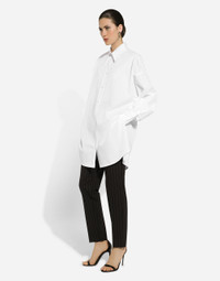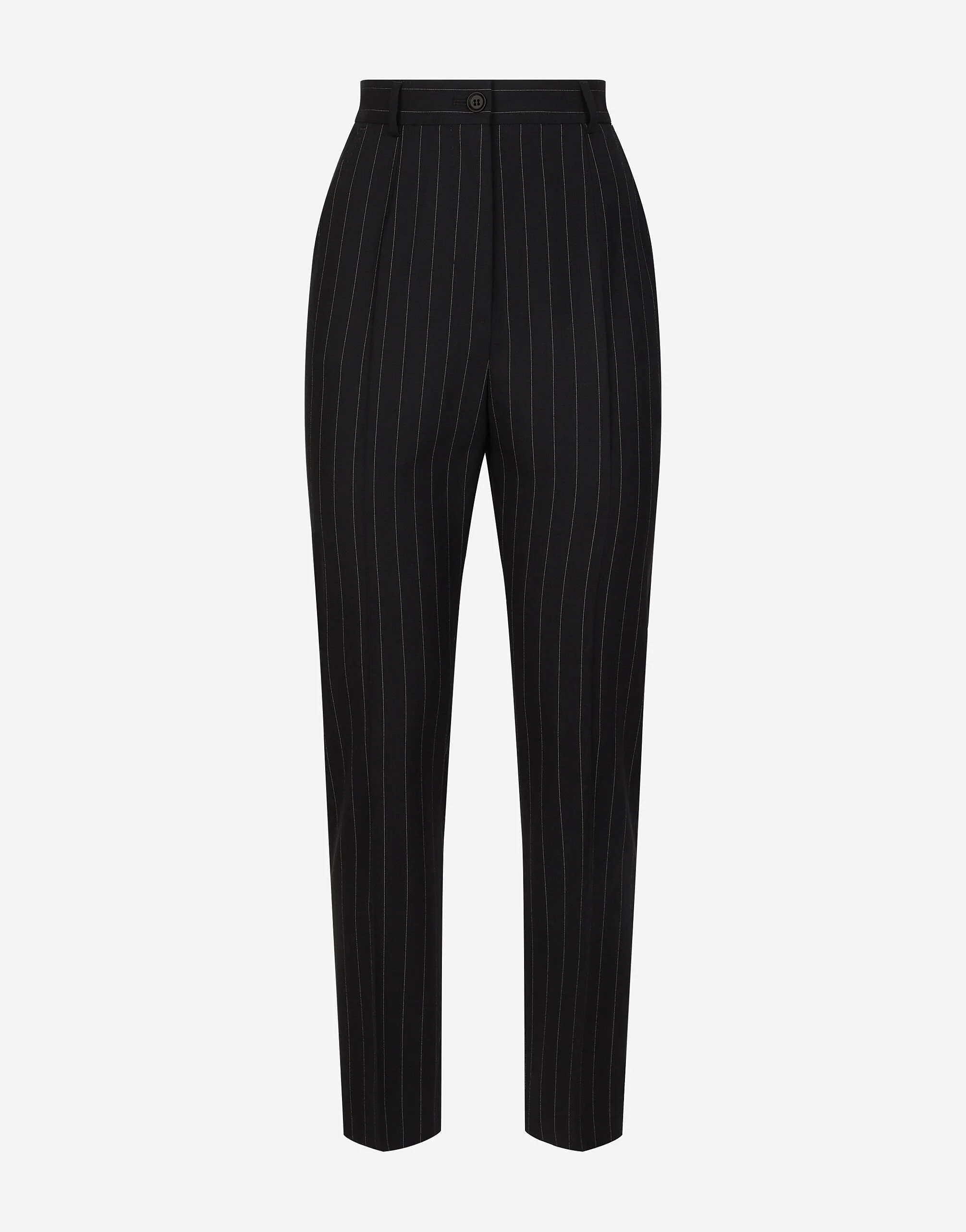 Inspired by 80s fashion photography, the Black Sicily collection masterfully blends masculine and feminine elements, pairing tailored cuts and corset details for the FW 24/25 season. A new vision of the iconic Nero Sicilia black is conveyed through contemporary and sensual looks: jackets and skirts in all-over glen plaid pair with openwork socks, while the 50s-inspired Mun shoes with Eva heel go with the houndstooth Sicily bag featuring crocodile-print leather inserts. Tailored pinstripe stretch wool pants: • Black • Dolce high waist • Front slant pockets • Welt back pockets • Belt loops • Inner leg: 74 cm • Hem: 17 cm • Zipper and button fastening • The model is 175 cm tall and wears a size IT 40 • Made in Italy External composition: 96% Virgin Wool 4% Spandex