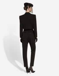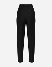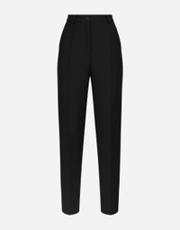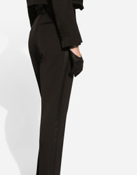 Menswear and womenswear mix and mingle, influencing one another and creating tailoring that embraces endless nuances, from the boldest to the most sophisticated, to define the rules of eternally classy femininity. A monochrome retelling in Nero Sicilia black, embellished by golden touches and rhinestones, adorning clean lines and incorporating stylish fabrics such as velvet, chiffon, lace, organza, and unique mesh details, the expression of authentic beauty for dresses, shirts and accessories. Tailored wool gabardine tuxedo pants: • Black • High-waisted • Front slant pockets • Welt back pockets • Inner leg: 74 cm • Hem: 17 cm • Zipper and button fastening • The model is 175 cm tall and wears a size IT 40 • Made in Italy External composition: 85% Virgin Wool 12% Silk 03% Polyester