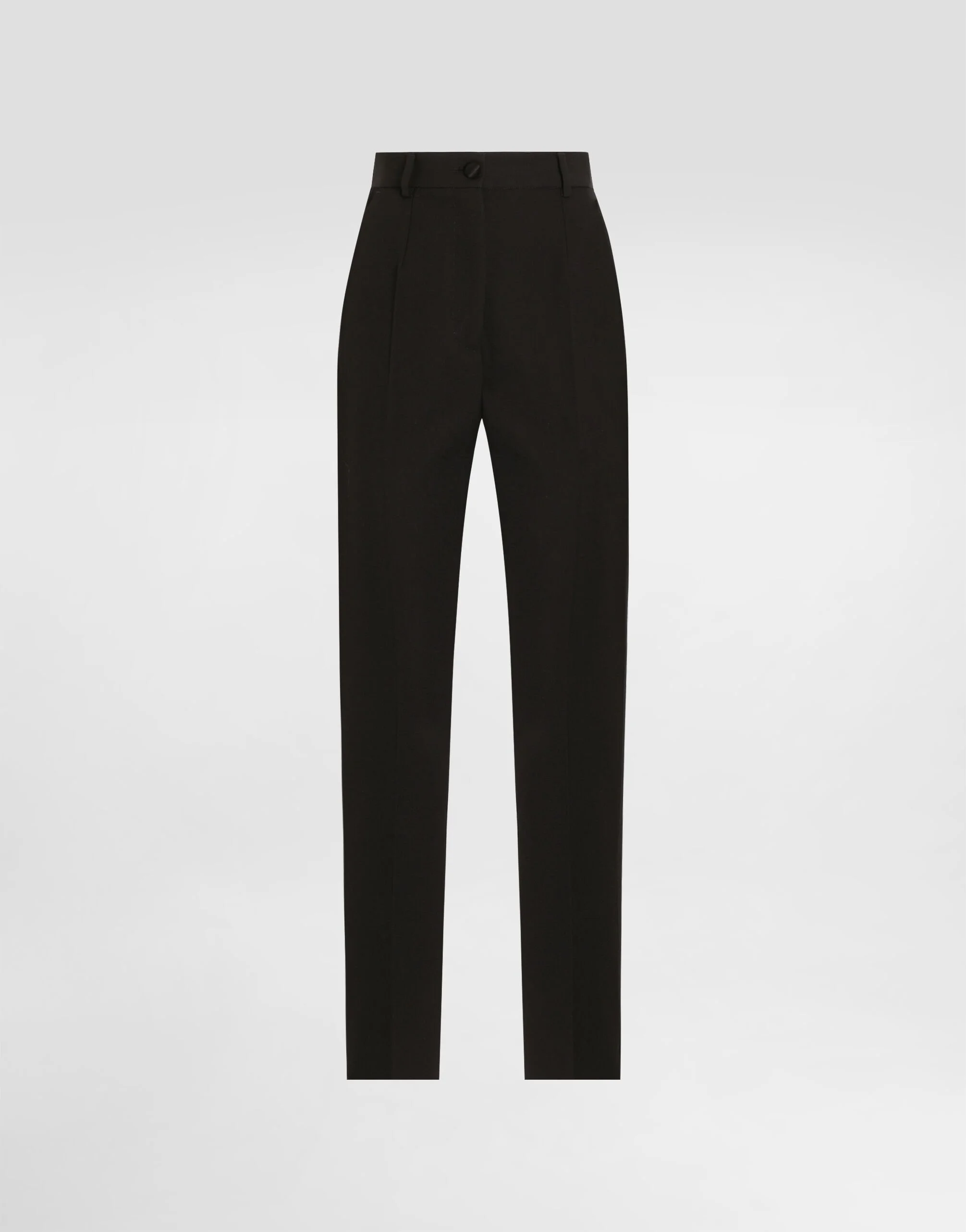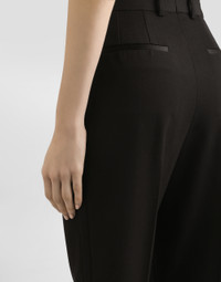 The Spring/Summer 2025 Women’s Collection is celebrating Italian beauty through bold and charismatic femininity. The 50s-inspired lingerie is the star, intermingling with fitted dresses, corsets and oversize trench coats. The iconic jackets have been updated with cropped cuts and modern inserts, while the floral prints add a romantic edge. The eveningwear shines with light fabrics and crystals, accompanied by look-defining accessories, from iconic bags to the cross earrings. Tailored woolen tuxedo pants: • Black • Dolce high waist • Front slant pockets • Welt back pockets • Belt loops • Inner leg: 74 cm • Hem: 17 cm • Zipper and covered button fastening • The model is 175 cm tall and wears a size IT 40 • Made in Italy External composition: 85% Virgin Wool 12% Silk 03% Polyester