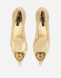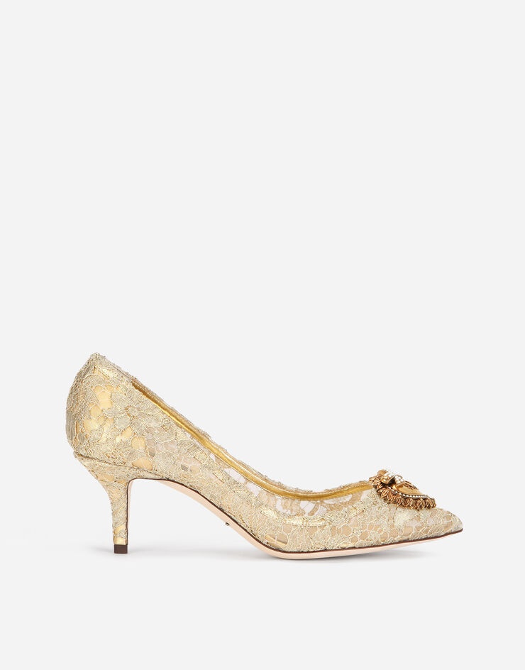 Dolce&Gabbana is presenting its special “Devotion” project, where the sacred heart pairs with iconic cordonetto lace on our Bellucci and Bianca shoes. The Sacred Heart is a fine detail that attests to the uniqueness of this collection. It is a sort of declaration of love that becomes a new, precious object of desire. For Stefano and Domenico, the heart embodies their personal, unique dedication to their work, to beauty and to the pursuit of perfection in every detail. The heart is harmoniously poised at the meeting place between symbolism, tradition and imagination, pairing with black and colored lace – the cornerstone of Dolce&Gabbana’s signature style – to create a timeless project that transcends trends and fashions to enhance the femininity and unique qualities of every woman. • Lace-covered mesh upper • 60 mm - 2.4 inches lace-covered heel • Leather insole with branded label • Smooth leather sole with logo detail • Item comes with themed packaging • Made in Italy Care And Details External composition: 52% Polyamide 38% Lambskin 10% Polyester