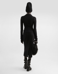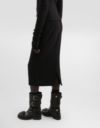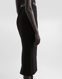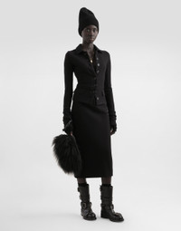 In the Fall/Winter 2025 Fashion Show Collection, shearling jackets, in fur-free versions, reveal slip dresses and create contrast' plays while denim welcomes fabric or Leo print inserts. Sweatshirts are the result of long experimentation with volumes. Evening looks become precious thanks to dresses with special embroideries and luminous touches of sequins and crystals. Sheepskin inserts also unite hats, shoes, and bags, including those with pockets. This pencil skirt embodies timeless elegance and sartorial refinement, perfect for enhancing the feminine silhouette with a touch of class and sensuality. Wool pencil skirt: • Black • With side slit at the back and slit at the center back • Belt 3 cm high • Zip at the center back up • Lined • The model is 175 cm tall and wears size 40 IT • Made in Italy External Composition: 100% Virgin Wool Internal Composition: 91% Silk, 9% Elastane