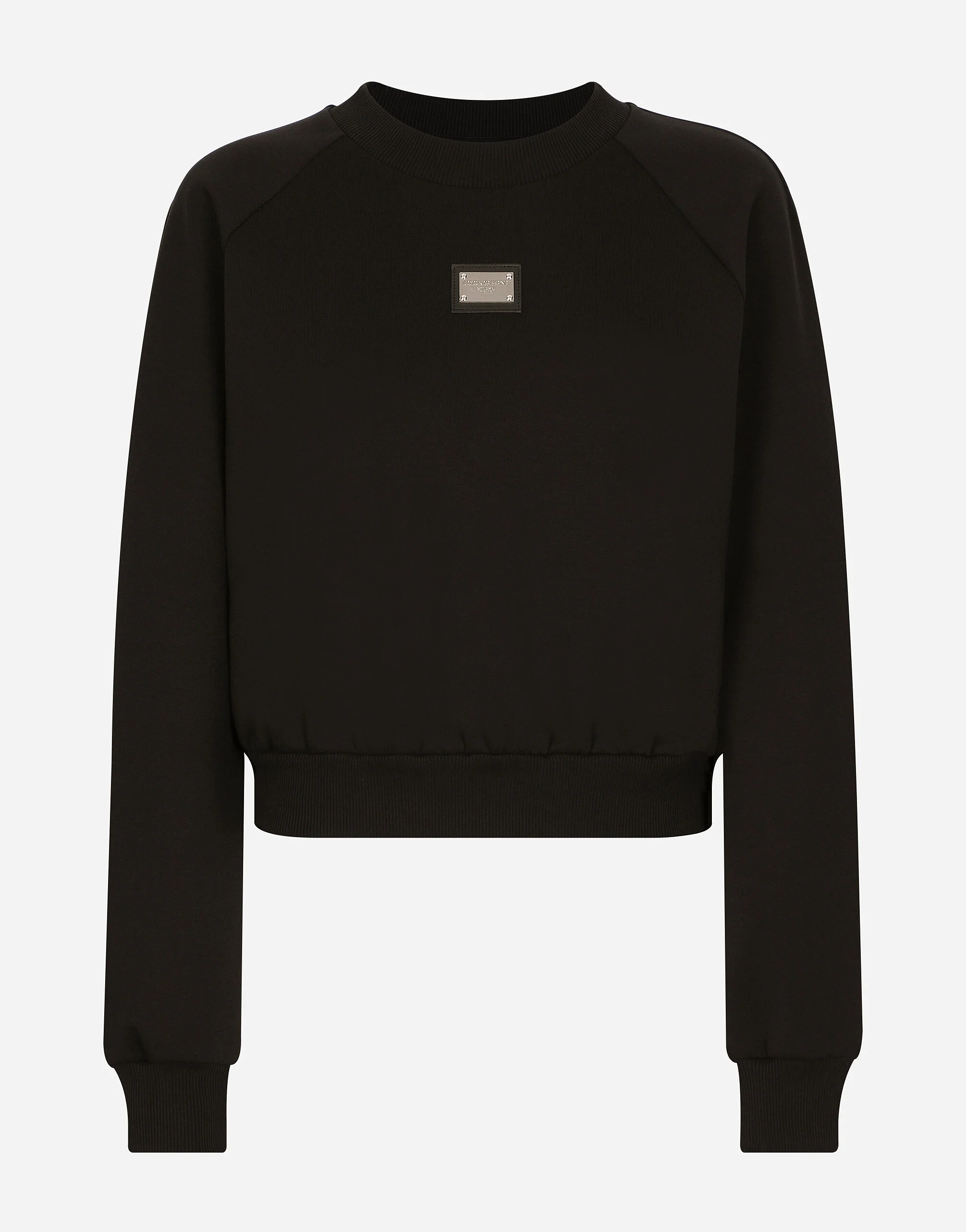 Technical jersey sweatshirt with Dolce&Gabbana tag: • Black • Round neck • Long sleeves • Cropped fit • Fine-rib trims • The piece measures 50 cm from the rear seam on a size M • The model is 175 cm tall and wears a size IT 40 • Made in Italy Care And Details External composition: 71% Cotton 29% Polyester