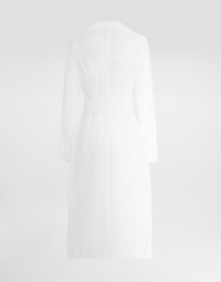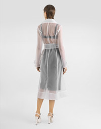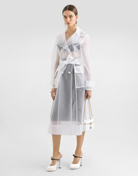 The Spring/Summer 2025 Women’s Collection is celebrating Italian beauty through bold and charismatic femininity. The 50s-inspired lingerie is the star, intermingling with fitted dresses, corsets and oversize trench coats. The iconic jackets have been updated with cropped cuts and modern inserts, while the floral prints add a romantic edge. The eveningwear shines with light fabrics and crystals, accompanied by look-defining accessories, from iconic bags to the cross earrings. Technical organza trench coat with georgette trims: • White • Notched lapels • Long sleeves • Patch pockets • Unlined • Button fastenings and belt • The piece measures 121 cm from the center back on a size IT 40 • The model is 175 cm tall and wears a size IT 40 • Made in Italy External composition: 90% Polyamide 10% Silk