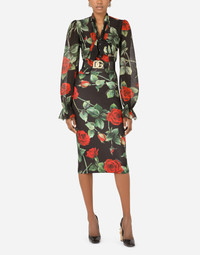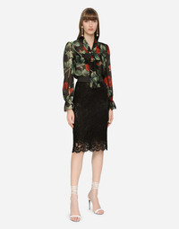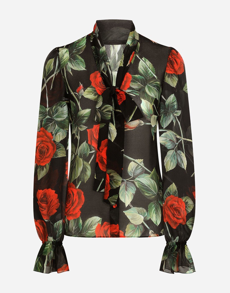Textured chiffon pussy-bow shirt with rose print