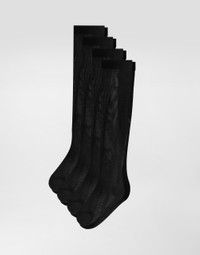 The Women's Black Sicily Collection reinforces Dolce&Gabbana's iconic fabrics and codes rooted in Italian heritage. Sensual silhouettes, highlighted by floral prints and refined corsetry, evoke an intriguing elegance, while the iconic black lace, satin, and velvet dominate the collection. Denim in various shades of blue introduces a contemporary twist, balancing the classic and modern. Embroidered crosses, medals, and jewelry add a sophisticated touch. Three-pack of nylon socks with DG logo on the heel: • Black • Made in Italy External composition: 88% Polyamide 11% Spandex 1% Cotton