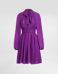 A refined chiffon dress that enhances femininity with elegant details and a flowing silhouette. Perfect for special occasions, this creation stands out for its sophisticated design and quality materials. Chiffon dress with draping: • Violet • Draped V-neck bodice • Scarf collar • Raglan sleeves • Draped belt • Full skirt • Invisible zip on the back • Matching underskirt • The model is 175 cm tall and wears size 40 IT • Made in Italy External Composition: 100% Silk Internal Composition: 94% Silk, 6% Elastane